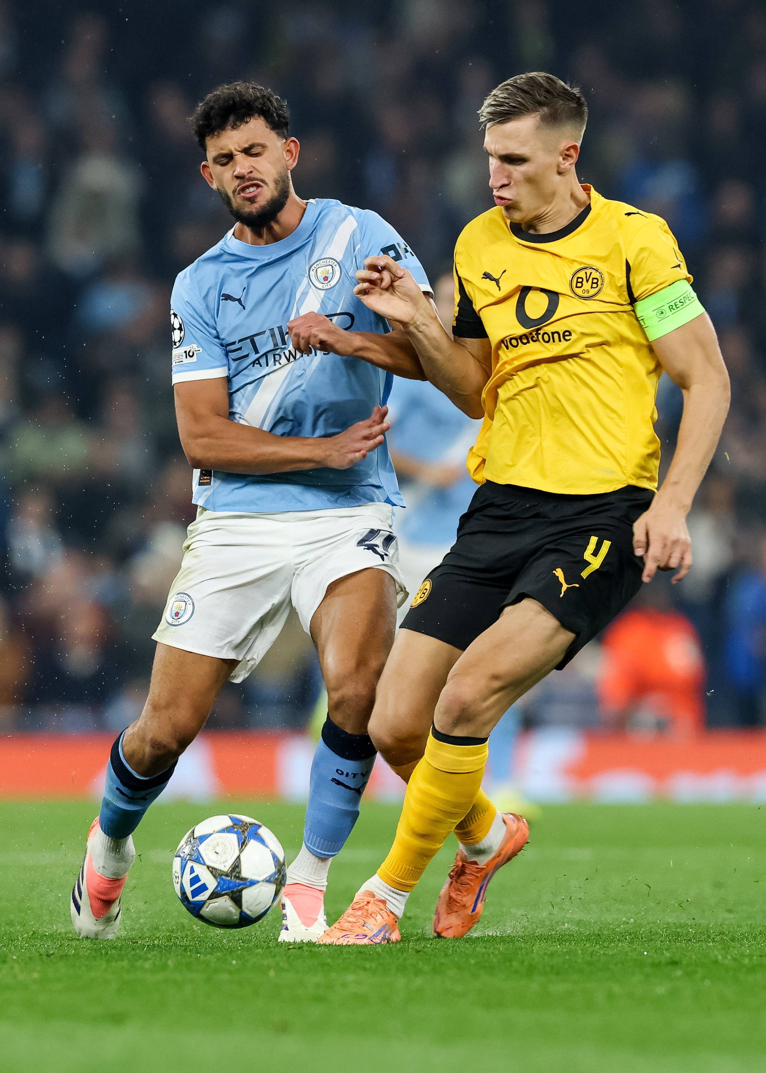 เมื่อวันที่ 5 พฤศจิกายน ดาร์วิน นูเญซ ของแมนเชสเตอร์ ซิตี้ (ซ้าย) ท้าทาย นิโค ชลอทเทอร์เบค ของโบรุสเซีย ดอร์ทมุนด์ ระหว่างการแข่งขัน ซินหัว/EPA