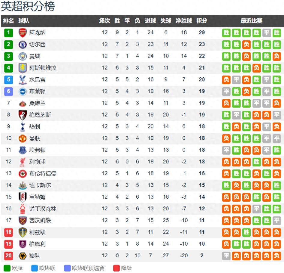 ตารางคะแนนพรีเมียร์ลีก หลังผ่านไป 12 นัด