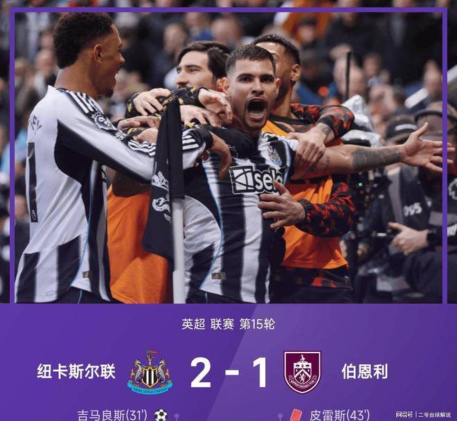 在25/26赛季英超第15轮的另一场比赛中,纽卡斯尔联主场迎战伯恩利。吉马良斯凭借一记直接角球破门,帮助纽卡斯尔联先拔头筹。随后,伯恩利的卢卡斯·皮雷斯放倒埃兰加,吃到红牌,伯恩利人数上少。接着,乌戈·舒库的手球犯规送给纽卡斯尔联一个点球机会,安东尼·戈登稳稳命中,纽卡斯尔联扩大领先优势。临近尾声,拉姆塞因手球犯规送点,弗莱明点球扳回一城。最终,纽卡斯尔联以2-1战胜伯恩利。