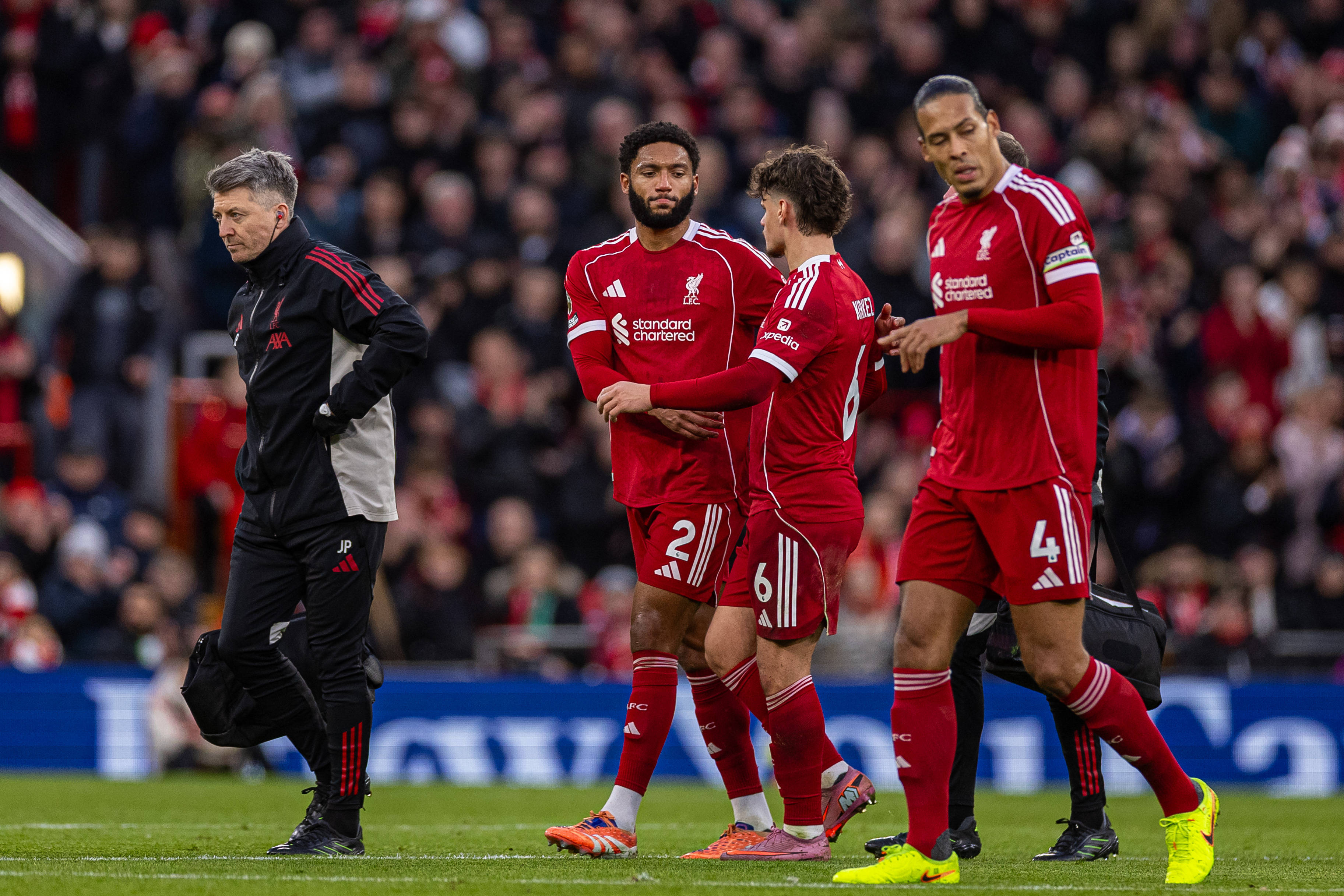 เมื่อวันที่ 13 ธันวาคม นักเตะลิเวอร์พูล โกเมซ (คนที่สองจากซ้าย) ถูกเปลี่ยนตัวออกจากสนามหลังจากได้รับบาดเจ็บ สำนักข่าวซินหัว