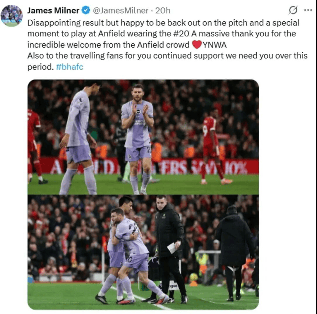 อัฒจันทร์ที่แอนฟิลด์ไม่เคยขาดเสียงปรบมือให้กับตำนาน เมื่อมิลเนอร์ก้าวลงสู่ทะเลสีแดงอันคุ้นเคยในชุดของไบรท์ตัน เสียงเชียร์กึกก้องดังไปทั่วสนาม – การปรากฏตัวครั้งแรกของเขาตั้งแต่ได้รับบาดเจ็บในเดือนตุลาคม และเป็นเรื่องราวที่อบอุ่นใจของการยกย่องและมรดกที่ทิ้งไว้ แม้ว่าไบรท์ตันจะจากไปโดยไม่มีชัยชนะ แต่ประตูสองลูกของกองหน้าลิเวอร์พูล เอคิติ ก็ช่วยให้หงส์แดงคว้าชัยชนะในนัดสำคัญที่มีค่าสามแต้มนี้ไปได้ อย่างไรก็ตาม นอกเหนือจากผลการแข่งขันแล้ว การปรากฏตัวของมิลเนอร์ในเกมนี้กลับกลายเป็นประเด็นที่สะเทือนใจที่สุด เมื่อนึกถึงการกลับมาที่แอนฟิลด์หลังจบการแข่งขัน มิลเนอร์ได้กล่าวด้วยความรู้สึกที่ชัดเจนว่า "ผลการแข่งขันนั้นน่าผิดหวังตามธรรมชาติ แต่การได้กลับมาลงสนามอีกครั้ง โดยเฉพาะอย่างยิ่งการสวมเสื้อหมายเลข 20 ที่แอนฟิลด์ มีความหมายอย่างยิ่งสำหรับผม"