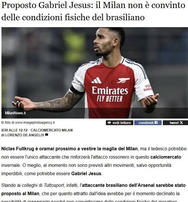 พระเยซู! มิลานปฏิเสธพระเยซู กองหน้าของอาร์เซนอลเคยเป็นผู้เล่นที่มิลานให้ความสนใจมาก่อน ซึ่งเคยมีข่าวว่าพวกเขาสนใจในตัวเขา อย่างไรก็ตาม นั่นเป็นเรื่องนานมาแล้ว มิลานในปัจจุบันไม่ไว้วางใจพระเยซู และสภาพร่างกายของเขาเป็นสาเหตุที่น่ากังวล แม้ว่าทั้งพระเยซูและอาร์เซนอลจะยินดีที่จะเปิดการเจรจากับมิลาน แต่รอสโซเนรีได้ปฏิเสธการเคลื่อนไหวดังกล่าว