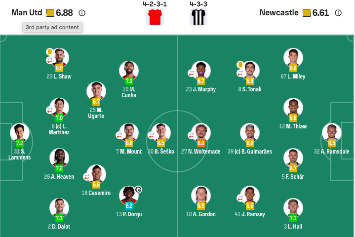 แมนเชสเตอร์ ยูไนเต็ด ตัวจริง: 31-ลามส์, 2-ดาล็อต, 26-ฮาเวน, 6-ลิซานโดร มาร์ติเนซ (88' 33-เฟรเดริคเซน), 23-ลุค ชอว์ (88' 12-มาเลเซีย), 13-ดอร์โก, 18-คาเซมิโร (60' 15-โยโร),25-อูการ์เต้, 7-เมาท์ (46' 38-เฟลทเชอร์), 10-คูน่า, 30-เซชโก้ (60' 11-ซิร์กเซ่)