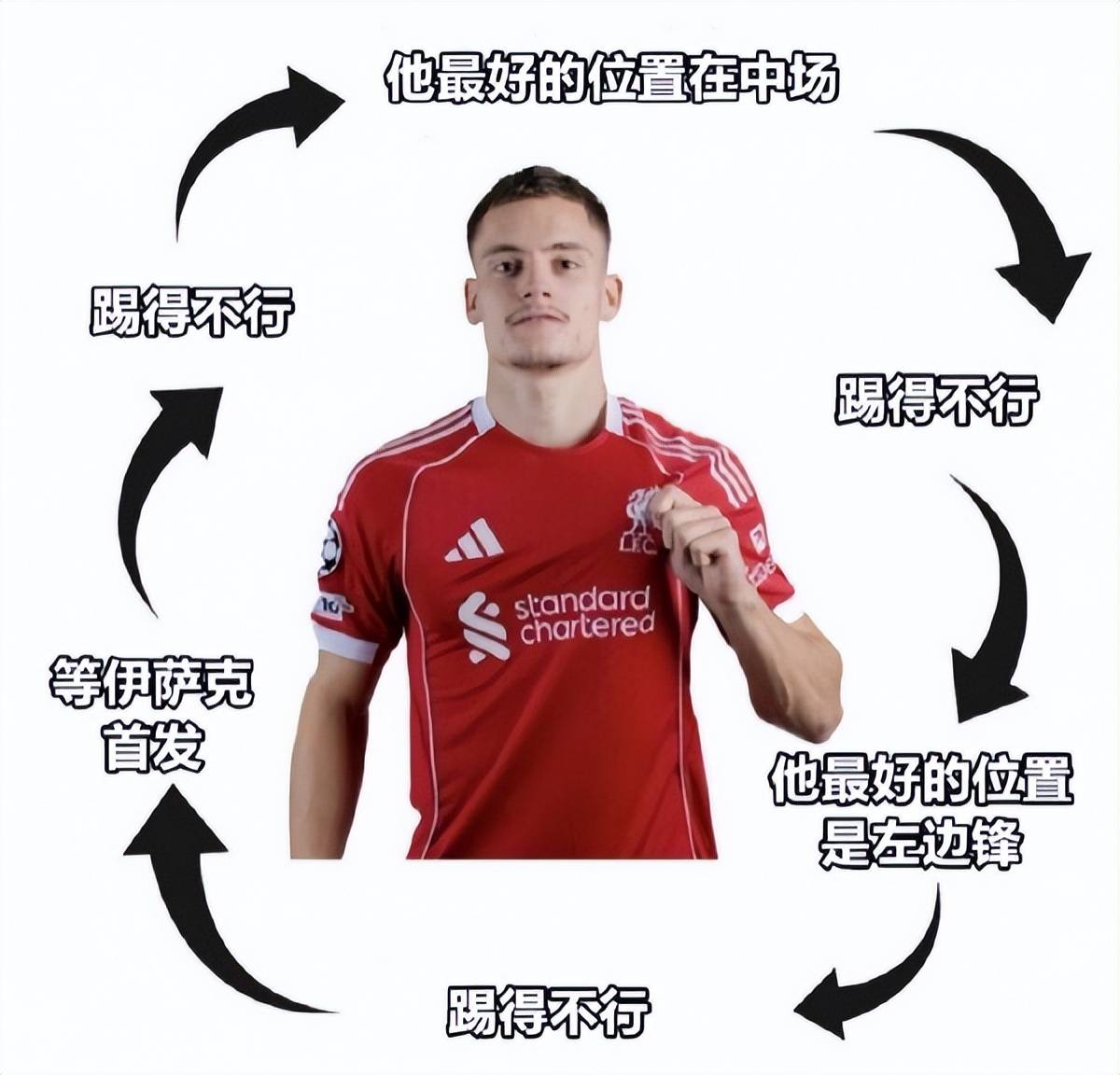 แฟนบอลบางคนได้พูดเล่นว่าอักษรย่อของฟลอเรียน เวิร์ตซ์ (FW) บอกทุกอย่างแล้ว แต่เห็นได้ชัดว่านี่เป็นมุมมองที่ง่ายเกินไป เวิร์ตซ์ไม่ได้ไร้ซึ่งความหวังที่ลิเวอร์พูลเลย การควบคุมบอลที่เฉียบคมของเขาสร้างความประทับใจว่าเป็นนักเตะที่เต็มไปด้วยพลังงาน อย่างไรก็ตาม เนื่องจากเขายังไม่สามารถทำประตูหรือแอสซิสต์ได้ ผลงานของเขามักถูกมองว่าเป็นเพียงการแสดงที่น่าตื่นตาแต่ขาดเนื้อหาสาระ