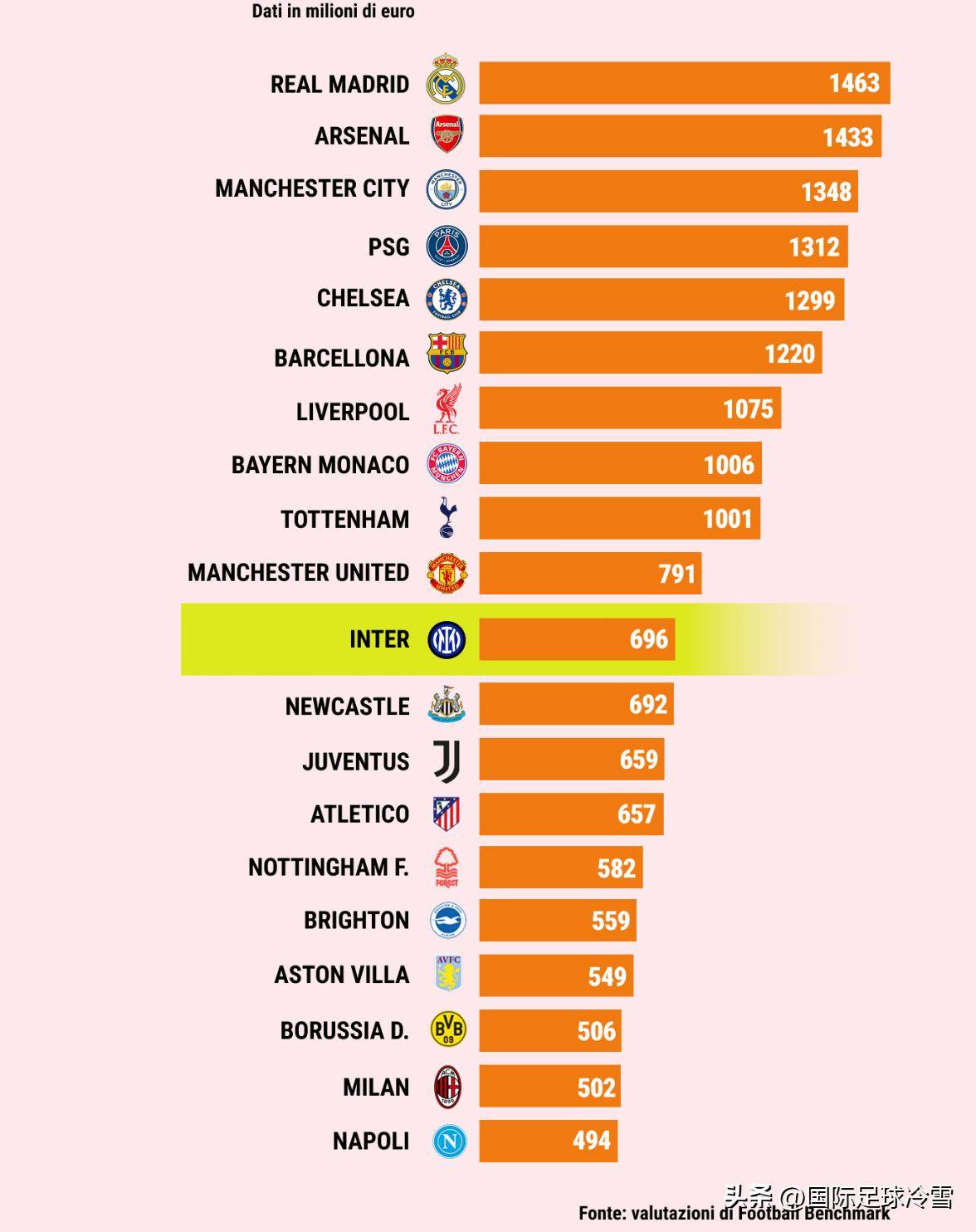 ตามรายงานประจำเดือนธันวาคมของหน่วยงาน มูลค่าปัจจุบันของอินเตอร์ มิลาน อยู่ที่ 696 ล้านยูโร หรือประมาณ 700 ล้านยูโร ทำให้เป็นสโมสรที่มีมูลค่าสูงที่สุดในเซเรีย อา และอยู่ในอันดับที่ 11 ของทวีปยุโรป