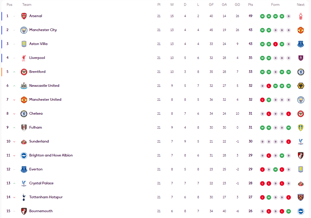 ลิเวอร์พูลยังคงอยู่ในอันดับที่สี่ด้วยคะแนน 35 คะแนนหลังจากเสมอ แมนเชสเตอร์ ยูไนเต็ด ซึ่งเสมอในรอบนี้ และเชลซี ซึ่งพ่ายแพ้ ตกลงมาอยู่ในอันดับที่หกและเจ็ดตามลำดับ เบรนท์ฟอร์ดและนิวคาสเซิล ยูไนเต็ด ตอนนี้ครองอันดับที่สี่และห้า