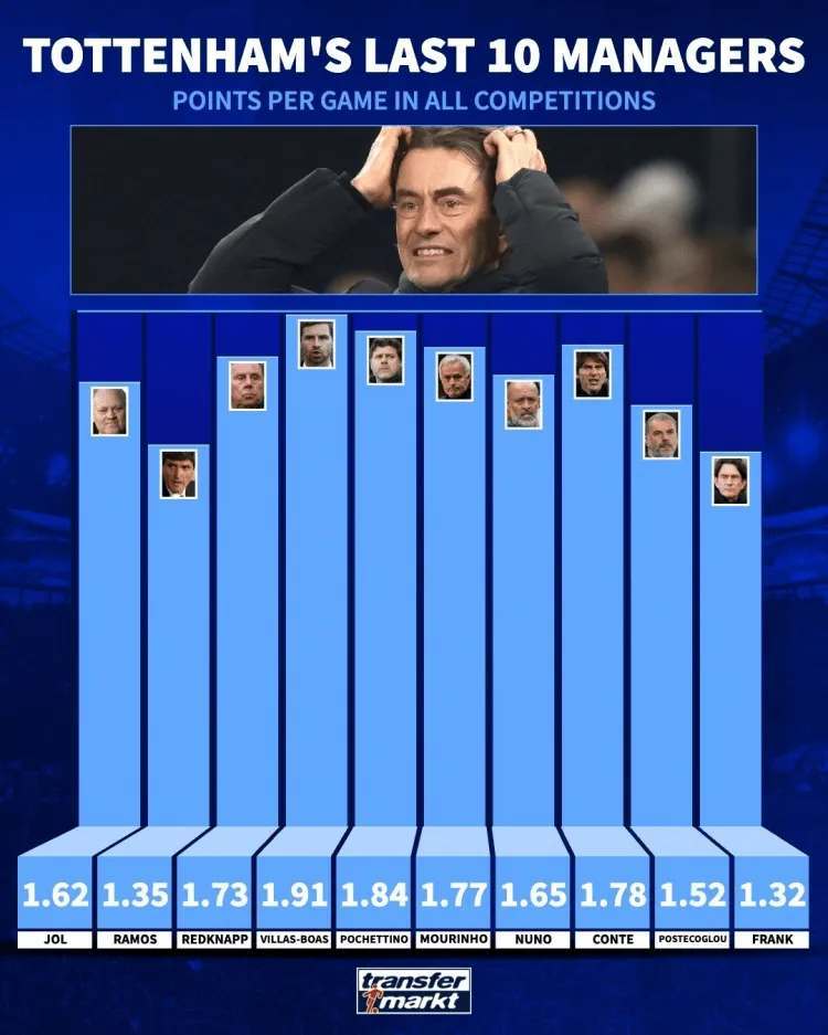 เมื่อวันที่ 11 มกราคม เว็บไซต์สถิติฟุตบอลเยอรมัน Transfermarkt ได้วิเคราะห์คะแนนเฉลี่ยต่อเกมในทุกการแข่งขันของผู้จัดการทีมท็อตแน่ม ฮ็อทสเปอร์ 10 คนล่าสุด โดยปัจจุบันหัวหน้าโค้ช แฟรงค์ แลมพาร์ด ทำคะแนนเฉลี่ยต่ำสุดเพียง 1.32 คะแนนต่อเกม