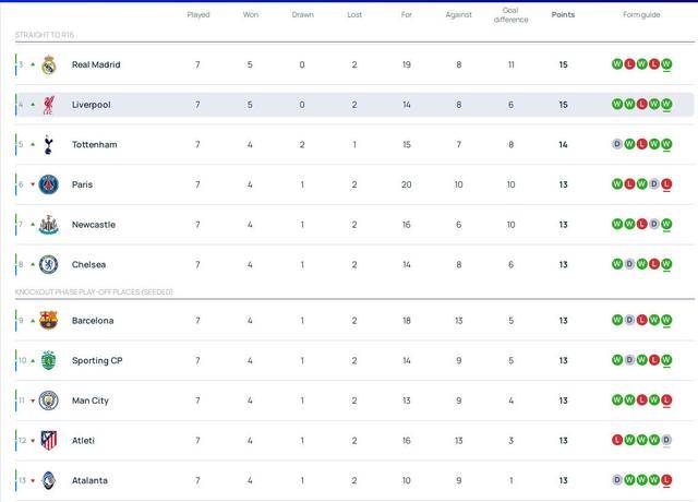 เหลือการแข่งขันเพียงนัดเดียวเท่านั้น นอกเหนือจากอาร์เซนอลและบาเยิร์น มิวนิกที่ได้การันตีการจบในอันดับแปดอันดับแรกแล้ว เรอัล มาดริดและลิเวอร์พูลมี 15 คะแนน, ท็อตแนม ฮ็อตสเปอร์มี 14 คะแนนปารีส แซงต์-แชร์กแมง, นิวคาสเซิล ยูไนเต็ด, เชลซี, บาร์เซโลนา, สปอร์ติง ซีพี, แมนเชสเตอร์ ซิตี้, แอตเลติโก มาดริด และอตาลันตา ต่างมี 13 คะแนนเท่ากัน อินเตอร์ มิลาน และยูเวนตุส มี 12 คะแนน และโบรุสเซีย ดอร์ทมุนด์ มี 11 คะแนน ทำให้มีแปดทีมที่ยังคงแข่งขันกันเพื่อชิงตำแหน่งในแปดอันดับสุดท้าย