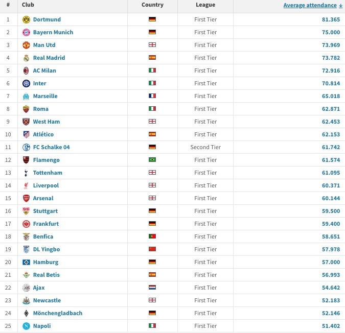 สโมสรที่จัดอันดับที่ 26 ถึง 53 มีดังนี้: 26. ลียง, จำนวนผู้ชมเฉลี่ย: 50,852 คน 34. ปารีส แซงต์-แชร์กแมง, จำนวนผู้ชมเฉลี่ย: 47,644 คน 41. ปักกิ่ง กั๋วอัน, จำนวนผู้ชมเฉลี่ย: 45,422 คน 44. แมนเชสเตอร์ ซิตี้, จำนวนผู้ชมเฉลี่ย: 43,605 คน 45. เอฟเวอร์ตัน, จำนวนผู้ชมเฉลี่ย: 43,337 คน 50. แอสตัน วิลล่า, จำนวนผู้ชมเฉลี่ย: 41,167 คน 51. ยูเวนตุส, จำนวนผู้ชมเฉลี่ย: 41,089 คน 52. เฉิงตู รงเฉิง, จำนวนผู้ชมเฉลี่ย: 40,820 คน 53. เชลซี, จำนวนผู้ชมเฉลี่ย: 39,766 คน
