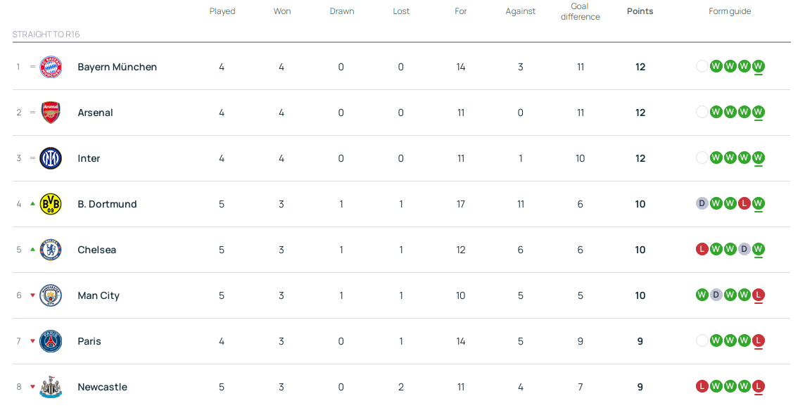 ปัจจุบัน ทีมที่ชนะสี่นัด ได้แก่ บาเยิร์น มิวนิค, อาร์เซนอล, และ อินเตอร์ มิลาน จะได้ลงเล่นในรอบสอง โดยทีมยักษ์ใหญ่จากบาวาเรียและทีมปืนใหญ่จะเผชิญหน้ากันโดยตรง อย่างไรก็ตาม พวกเขายังคงครองตำแหน่งสามอันดับแรกในตารางคะแนนก่อนการแข่งขันของพวกเขา