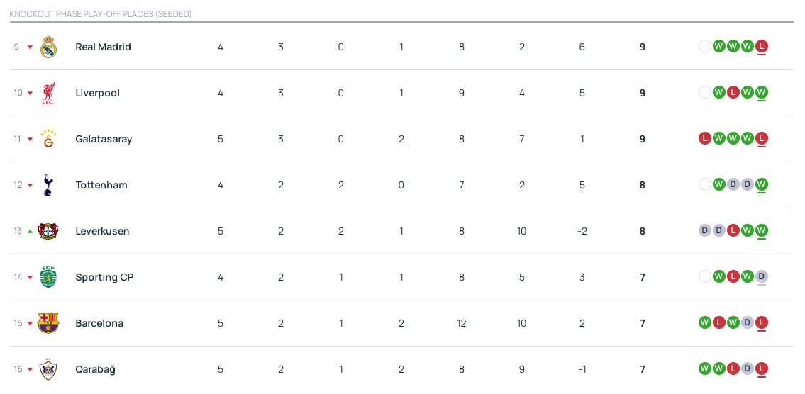 ในบรรดาทีมที่อยู่ในอันดับที่ 9 ถึง 16 ในปัจจุบัน ทีมที่ยังไม่ได้ลงเล่น ได้แก่: เรอัล มาดริด และ ลิเวอร์พูล ทั้งสองทีมมี 9 คะแนน; ท็อตแน่ม ฮ็อตสเปอร์ มี 8 คะแนน; และ สปอร์ติ้ง ซีพี มี 7 คะแนน พวกเขายังคงมีศักยภาพที่จะไต่อันดับขึ้นไปอีก