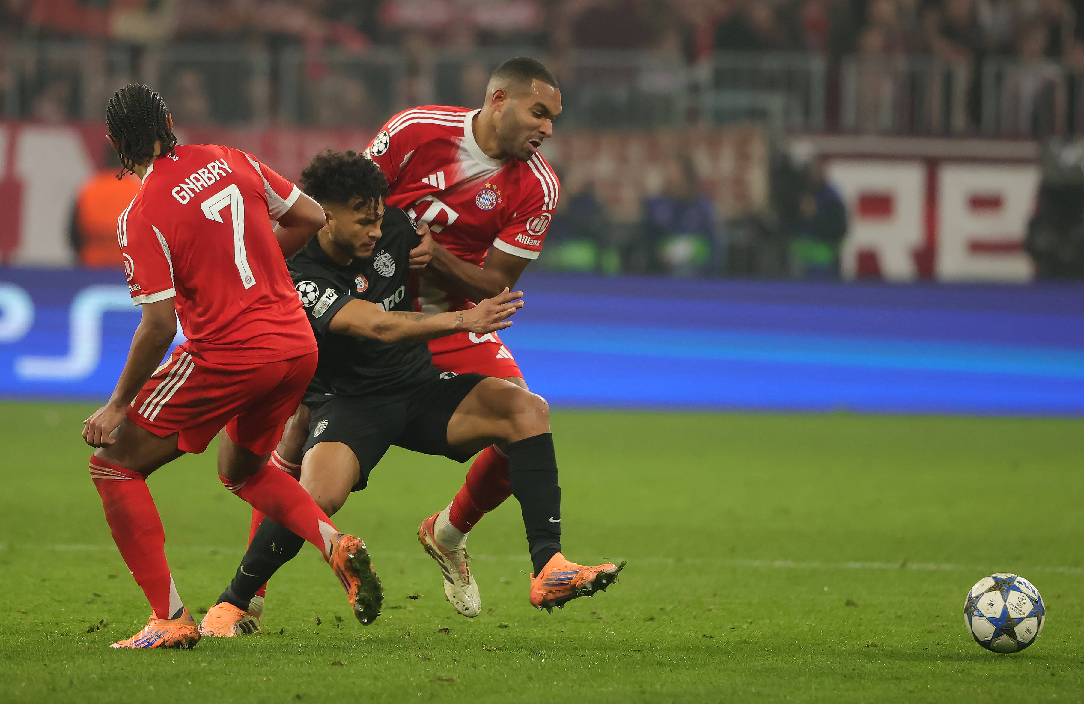 เมื่อวันที่ 9 ธันวาคม ทาห์ ของบาเยิร์น มิวนิก (ขวา) และไวนิดิส ของสปอร์ติ้ง ซีพี (กลาง) แย่งชิงการครองบอลระหว่างการแข่งขัน สำนักข่าวซินหัว (ภาพโดย ฟิลิปป์ รุยซ์)