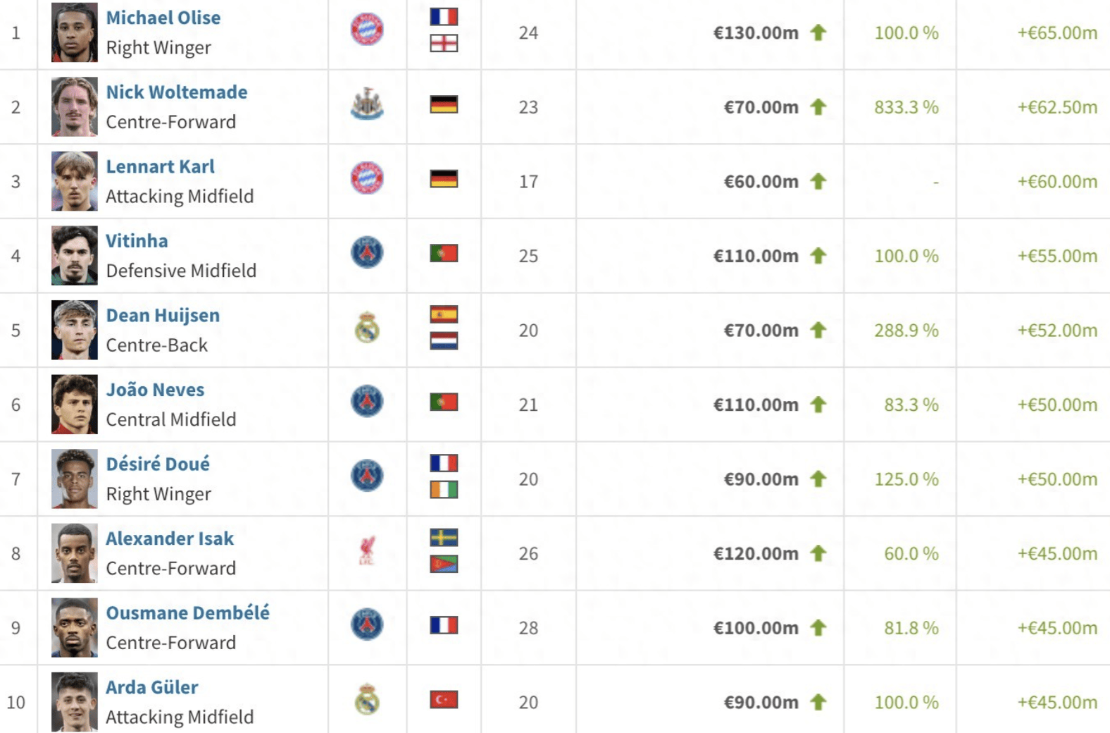 มูลค่าตลาดของโอริสเซ่พุ่งสูงขึ้นถึง 65 ล้านยูโรในช่วงปีที่ผ่านมา ซึ่งเป็นการเพิ่มขึ้นสูงสุดในวงการฟุตบอล ขณะนี้มีมูลค่าอยู่ที่ 130 ล้านยูโร อันดับสองคือโวลเตอร์เมด นักเตะทีมชาติเยอรมนี ซึ่งมูลค่าของเขาเพิ่มขึ้นถึง 62.5 ล้านยูโร จากเพียง 7.5 ล้านยูโรเมื่อปีที่แล้ว และในปัจจุบันมีมูลค่าอยู่ที่ 70 ล้านยูโรในขณะเดียวกัน คาร์ลจากเยอรมนีได้เพิ่มมูลค่าจากศูนย์เป็นมูลค่าปัจจุบันที่ 60 ล้านยูโร