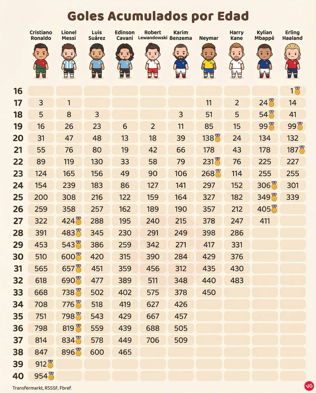 ในจำนวนนี้ คริสเตียโน โรนัลโด ซึ่งเป็นผู้ทำประตูสูงสุดในปัจจุบัน นำเพียงสองช่วงอายุเท่านั้น: ที่อายุ 39 ปี ด้วย 912 ประตู และที่อายุ 40 ปี ด้วย 956 ประตู ในทุกช่วงอายุอื่น ๆ โรนัลโดไม่ได้ครองตำแหน่งสูงสุด เออร์ลิง ฮาลันด์ นำในสามช่วงอายุ แม้ว่าหนึ่งในนั้น—ที่อายุ 16 ปี—จะเป็นไปได้เพียงเพราะประตูของยูสซูฟา มูโกโกไม่ได้ถูกนับรวมฮาแลนด์ทำประตูได้หนึ่งลูกตอนอายุ 16 ปี ในขณะที่ยามาลยิงได้แปดลูกในวัยเดียวกัน ทำให้ยามาลเป็นแชมป์การทำประตูที่แท้จริงในวัย 16 ปี ฮาแลนด์ครองตำแหน่งสูงสุดในวัย 19 และ 21 ปี เอ็มบัปเป้เป็นผู้นำในหกช่วงอายุ: 17, 18, 19, 24, 25 และ 26 ปี