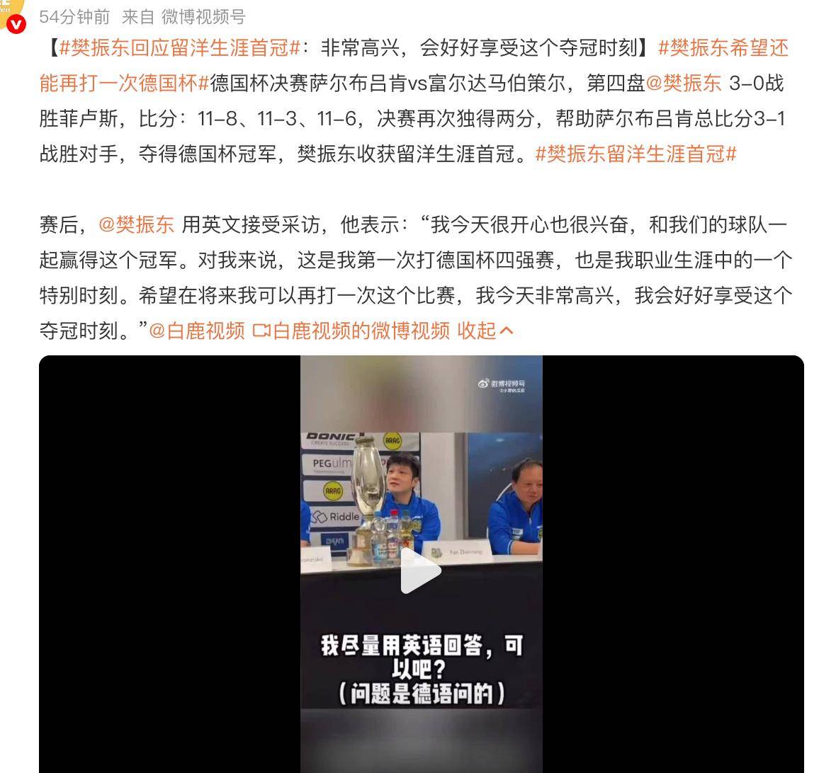 ในแง่ของความสำเร็จส่วนบุคคล ฟาน เจินตง ได้คว้าแชมป์แกรนด์สแลมสูงสุดแล้ว ทำให้เขาเป็นนักกีฬาที่ประสบความสำเร็จมากที่สุดในทีมปิงปองชาติของเรา แม้ว่าเขาจะเลิกแข่งขันให้กับทีมชาติในอนาคต เขาก็ได้ไปถึงจุดสูงสุดของอาชีพแล้ว ในทางกลับกัน หากพี่ดงฟื้นตัวได้สำเร็จที่นี่ในเยอรมนีและกลับเข้าร่วมทีมชาติในที่สุด มันจะเสริมความแข็งแกร่งให้กับทีมชายของเราอย่างแน่นอน ซึ่งเป็นสิ่งที่แฟนๆ หลายคนปรารถนาเรายังตั้งตารอให้ฟาน เจินตง ยังคงเพลิดเพลินกับการแข่งขันของเขาในเยอรมนี และหวังว่าจะได้พบกับแฟนๆ ชาวจีนอีกครั้งบนเวทีการแข่งขันของทีมชาติ