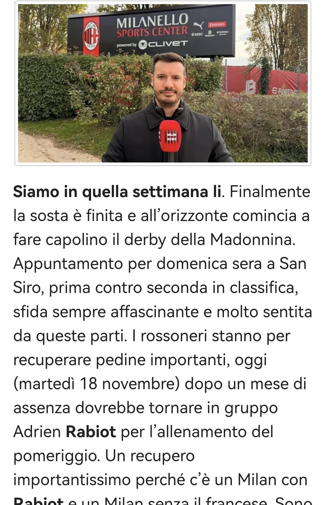 สัปดาห์แห่งมิลานดาร์บี้มาถึงแล้ว! ช่วงพักเบรกทีมชาติได้สิ้นสุดลงอย่างเป็นทางการ และ 'มาดอนน่าดาร์บี้' ที่ซานซิโรกำลังจะเริ่มขึ้นในไม่ช้า – การเผชิญหน้าของสองทีมจ่าฝูงจะเริ่มขึ้นในคืนวันอาทิตย์ที่สนามซานซิโร ซึ่งสองทีมชั้นนำของลีกจะปะทะกันในการแข่งขันที่ทุกคนรอคอยรอสโซเนรีเตรียมต้อนรับผู้เล่นคนสำคัญกลับมา: หลังจากหายไปหนึ่งเดือน อาเดรียน ราบิโอต์ คาดว่าจะกลับมาร่วมทีมฝึกซ้อมเต็มรูปแบบในบ่ายวันนี้ (วันอังคารที่ 18 พฤศจิกายน)