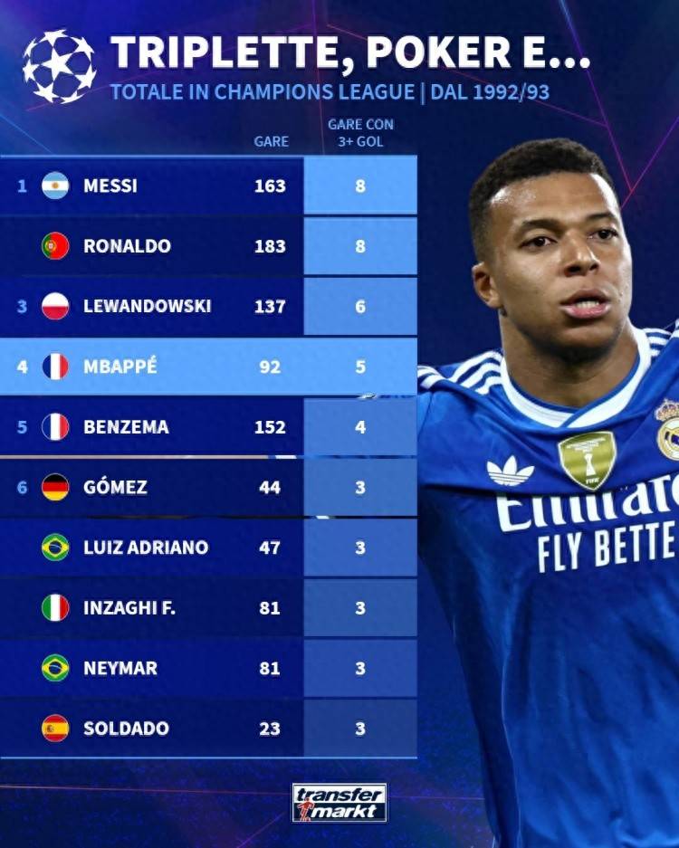 หลังจากการสิ้นสุดรอบที่ห้าของรอบแบ่งกลุ่มแชมเปียนส์ลีก Transfermarkt ได้รวบรวมรายชื่อผู้เล่นสิบอันดับแรกที่มีผลงานทำสามประตูหรือมากกว่าในนัดเดียวมากที่สุดนับตั้งแต่การแข่งขันถูกปรับโครงสร้างในฤดูกาล 1992-93 ลิโอเนล เมสซี่ และคริสเตียโน่ โรนัลโด้ ครองอันดับสูงสุดร่วมกันด้วยผลงานแปดครั้งเท่ากัน ขณะที่โรเบิร์ต เลวานดอฟสกี้อยู่ในอันดับสามด้วยหกครั้ง คีเลียน เอ็มบัปเป้ ซึ่งทำสี่ประตูในรอบนี้ อยู่ในอันดับสี่ด้วยผลงานห้าครั้ง