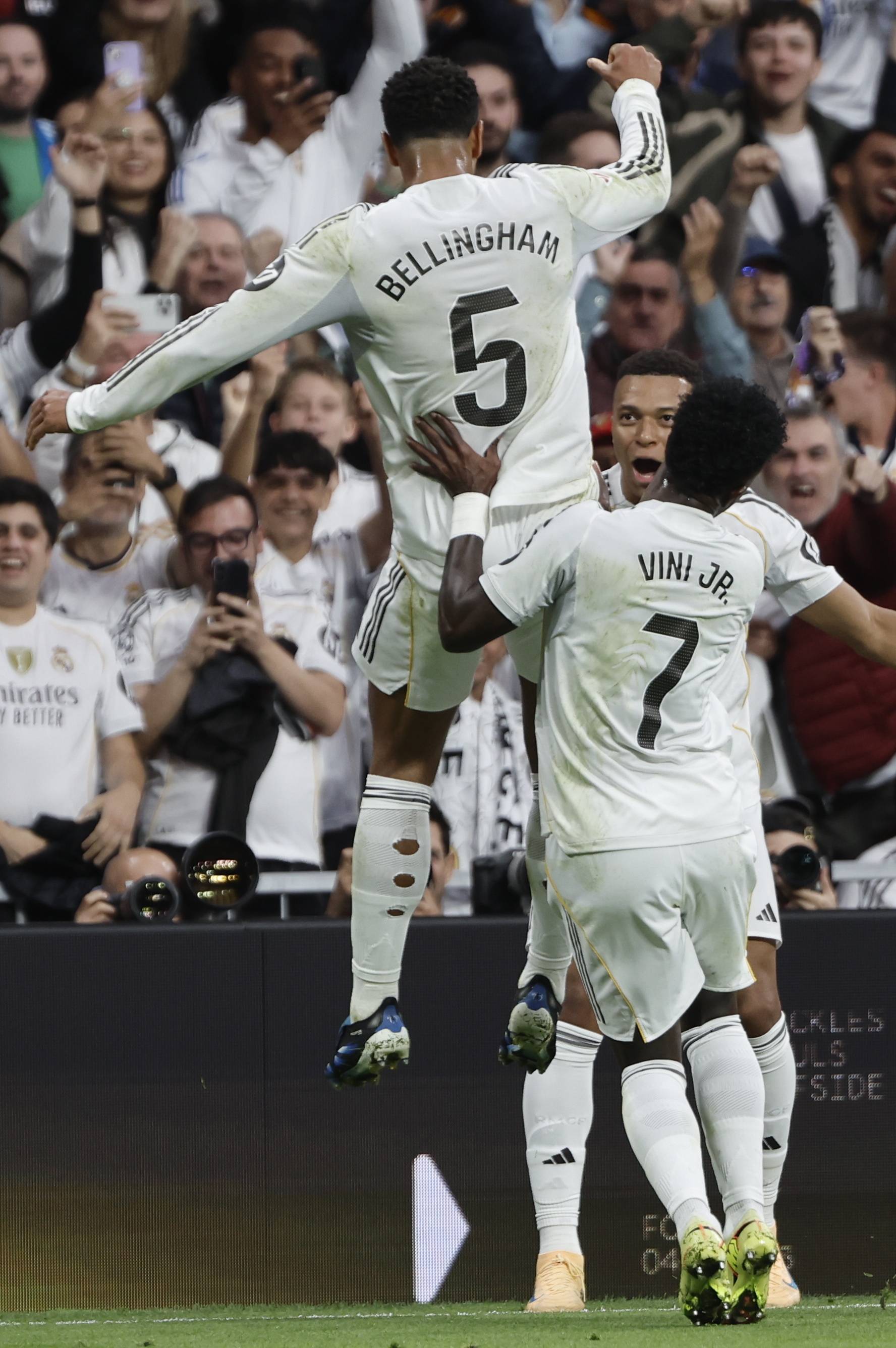 เมื่อวันที่ 26 ตุลาคม คีเลียน เอ็มบัปเป้ (กลาง) นักเตะของเรอัล มาดริด ฉลองกับเพื่อนร่วมทีมหลังจากทำประตูเปิดให้กับทีมของเขา สำนักข่าวซินหัว/EPA