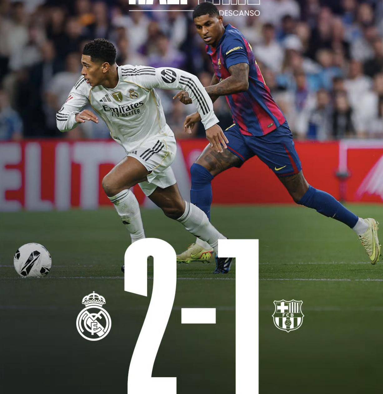 ในนาทีที่ 37 กิเยร์เม ดูลังเลขณะเคลียร์บอลจากแดนตัวเอง ทำให้บาร์เซโลนาสามารถตัดบอลได้สำเร็จ แรชฟอร์ดจ่ายบอลทะลุช่องให้ เฟอร์มิน หลุดเข้าไปยิงตุงตาข่าย ตีเสมอเป็น 1-1เมื่อครึ่งแรกใกล้จะจบลง เรอัล มาดริดกลับมาขึ้นนำอีกครั้ง ในนาทีที่ 43 วินิซิอุส จูเนียร์ พาบอลขึ้นทางฝั่งซ้ายก่อนจะเปิดบอลเข้าไปในกรอบเขตโทษ มิลิเตาโหม่งต่อให้เบลลิงแฮมยิงเข้าไปตุงตาข่ายโล่งๆ จบครึ่งแรก เรอัล มาดริดนำ 2-1 โดยครองเกมได้เหนือกว่า โดยเฉพาะจากแนวรุก ขณะที่แนวรับของบาร์เซโลนาดูจะรับมือไม่ไหว