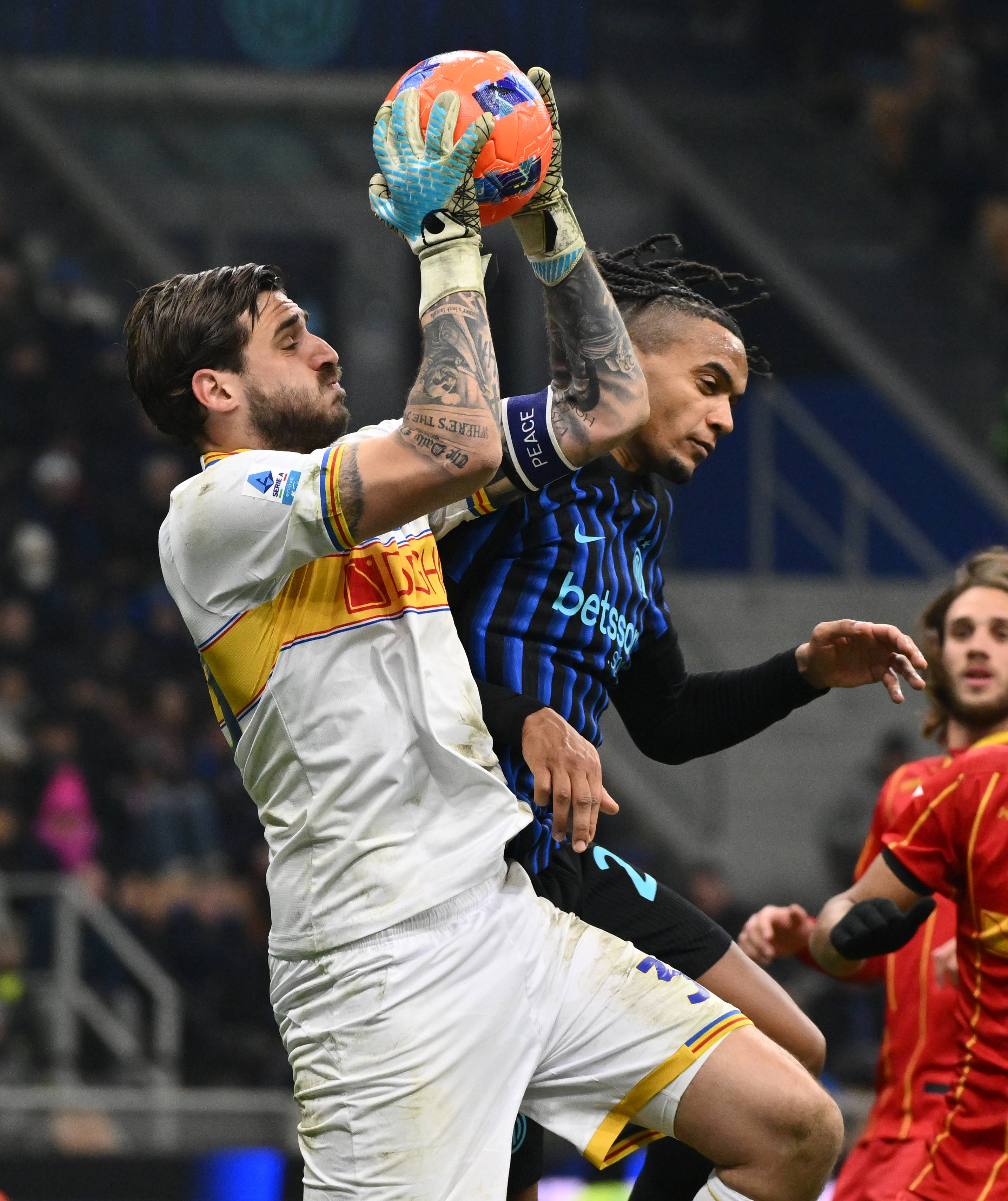 เมื่อวันที่ 14 มกราคม มานูเอล อาคานจี ของอินเตอร์ มิลาน (ขวา) เข้าปะทะกับจานลูก้า ฟัลโกเน่ ผู้รักษาประตูของเลชเช่ ระหว่างการแข่งขัน สำนักข่าวซินหัว (ภาพโดย อัลแบร์โต ลิงเกีย)