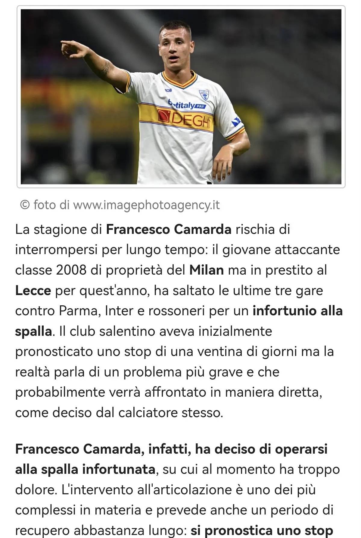 ในความเป็นจริง เนื่องจากความเจ็บปวดอย่างรุนแรงที่ไหล่ที่ได้รับบาดเจ็บ ฟรานเชสโก คามาร์ดา ได้ตัดสินใจเข้ารับการผ่าตัดไหล่ การผ่าตัดข้อประเภทนี้ถือว่ามีความซับซ้อนสูงและต้องใช้เวลาฟื้นฟูหลังการผ่าตัดค่อนข้างนาน: กองหน้าดาวรุ่งของเอซี มิลาน คาดว่าจะต้องพักรักษาตัวเป็นเวลาสองถึงสามเดือน