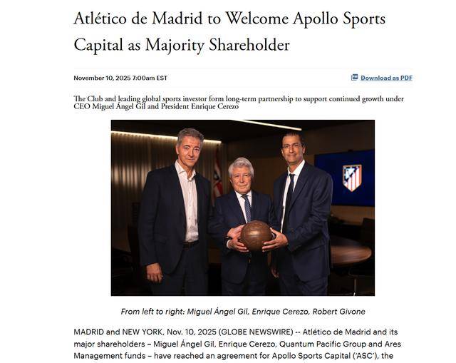 บริษัท Apollo Asset Management ได้ก่อตั้ง "Apollo Sports Capital" ในเดือนกันยายนปีนี้ โดยมีรายงานว่ากองทุนมีขนาดถึง 5 พันล้านดอลลาร์สหรัฐ การเข้าซื้อหุ้นส่วนใหญ่ในสโมสรแอตเลติโก มาดริด จึงถือเป็นการลงทุนครั้งสำคัญครั้งแรกของกองทุนนับตั้งแต่ก่อตั้ง