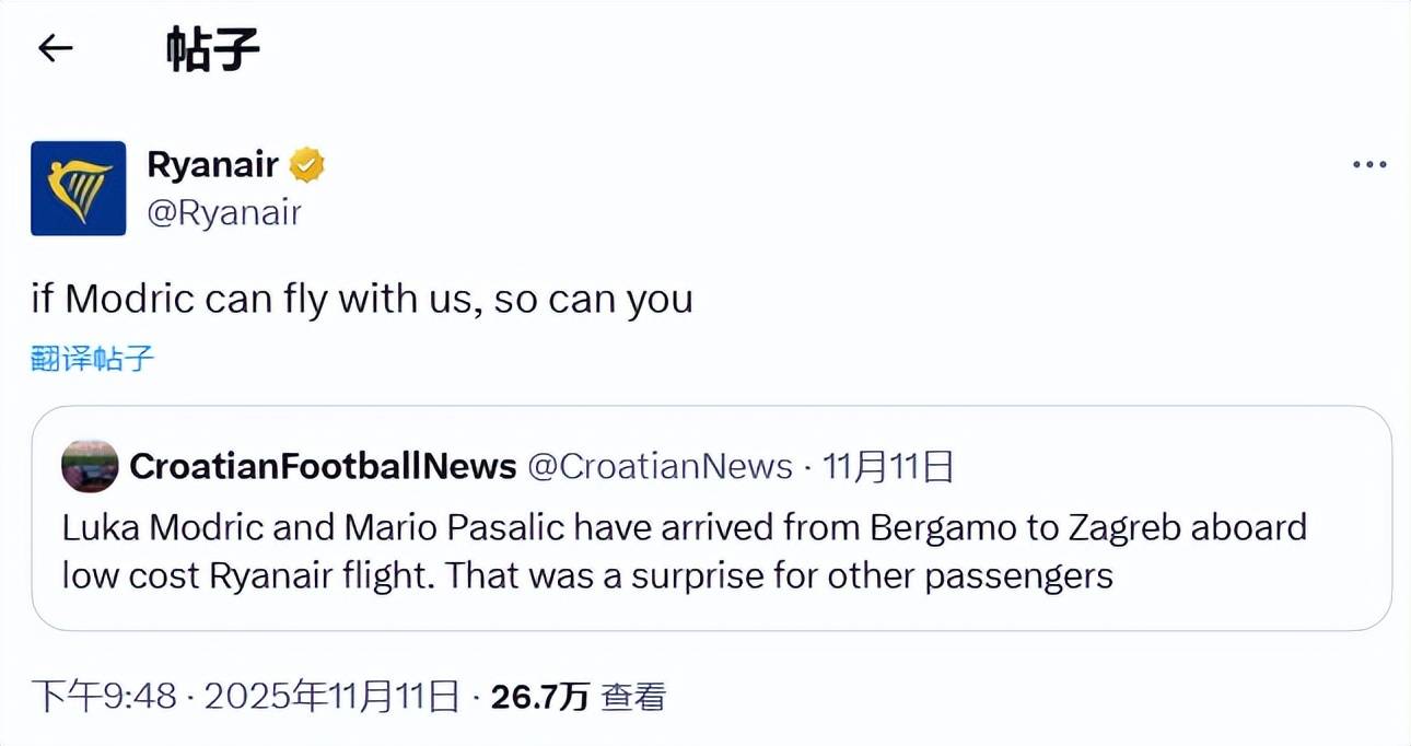 บัญชี 'Croatian Football News' เปิดเผยรายละเอียดการเดินทางด้วยสายการบินราคาประหยัดของลูก้า โมดริชในวันที่ 11 ซึ่งได้รับความสนใจอย่างกว้างขวางอย่างรวดเร็ว Ryanair ฉวยโอกาสนี้ในการโปรโมตบริการของพวกเขา: "ถ้าโมดริชบินกับเราได้ คุณก็บินได้เช่นกัน" รายงานจากสื่อมวลชนได้เพิ่มรายละเอียดเพิ่มเติม: เที่ยวบินของโมดริชลงจอดที่กรุงซาเกร็บเมื่อเวลา 23.00 น. ของวันอาทิตย์ที่ผ่านมา โดยมีผู้โดยสารประมาณ 200 คน เมื่อผู้โดยสารทราบด้วยความยินดีว่าโมดริชและปาชาลิชอยู่บนเที่ยวบินเดียวกัน ความตื่นเต้นของพวกเขาก็ปรากฏให้เห็นอย่างชัดเจน พวกเขาต่างรีบเข้าไปหาทั้งสองเพื่อขอถ่ายรูปและจับมือ ซึ่งทั้งสองดาวดังก็ให้ความร่วมมืออย่างอดทน ทำให้บรรยากาศเต็มไปด้วยความคึกคัก
