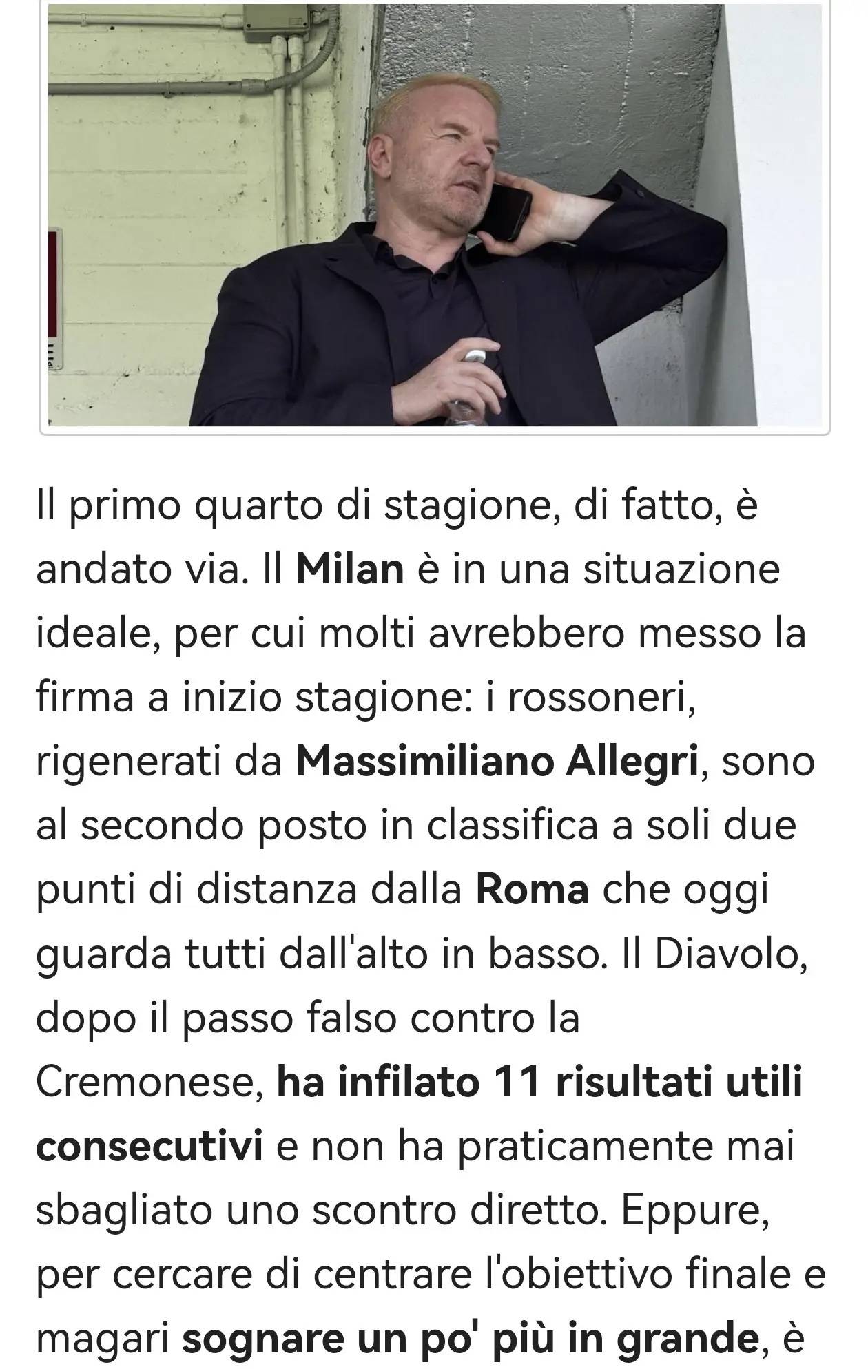 ไตรมาสแรกของฤดูกาลได้สิ้นสุดลงอย่างเป็นทางการแล้ว ขณะนี้มิลานอยู่ในตำแหน่งที่เหมาะสมอย่างยิ่ง โดยหลายคนได้ทำนายไว้ตั้งแต่เริ่มต้นฤดูกาลว่าพวกเขาจะประสบความสำเร็จ: ภายหลังจากกระบวนการปรับโครงสร้างภายใต้การนำของมาซซิมิเลียโน อัลเลกรี ทีมรอสโซเนรีอยู่ในอันดับที่สองของตาราง ตามหลังผู้นำอย่างโรมาเพียงสองคะแนน