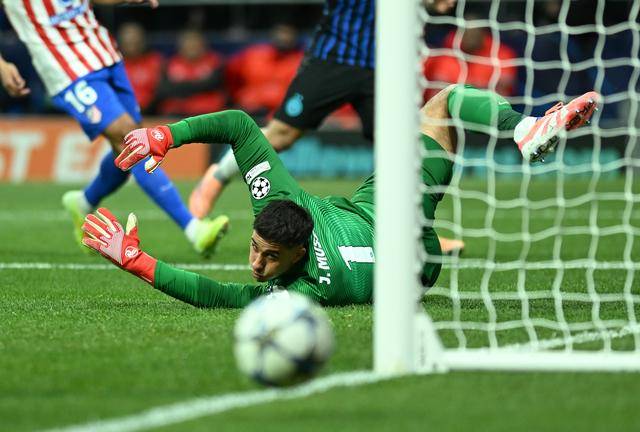 ↑ มุสโซ ผู้รักษาประตูของแอตเลติโก มาดริด (ด้านบน) เซฟลูกยิงระหว่างการแข่งขัน