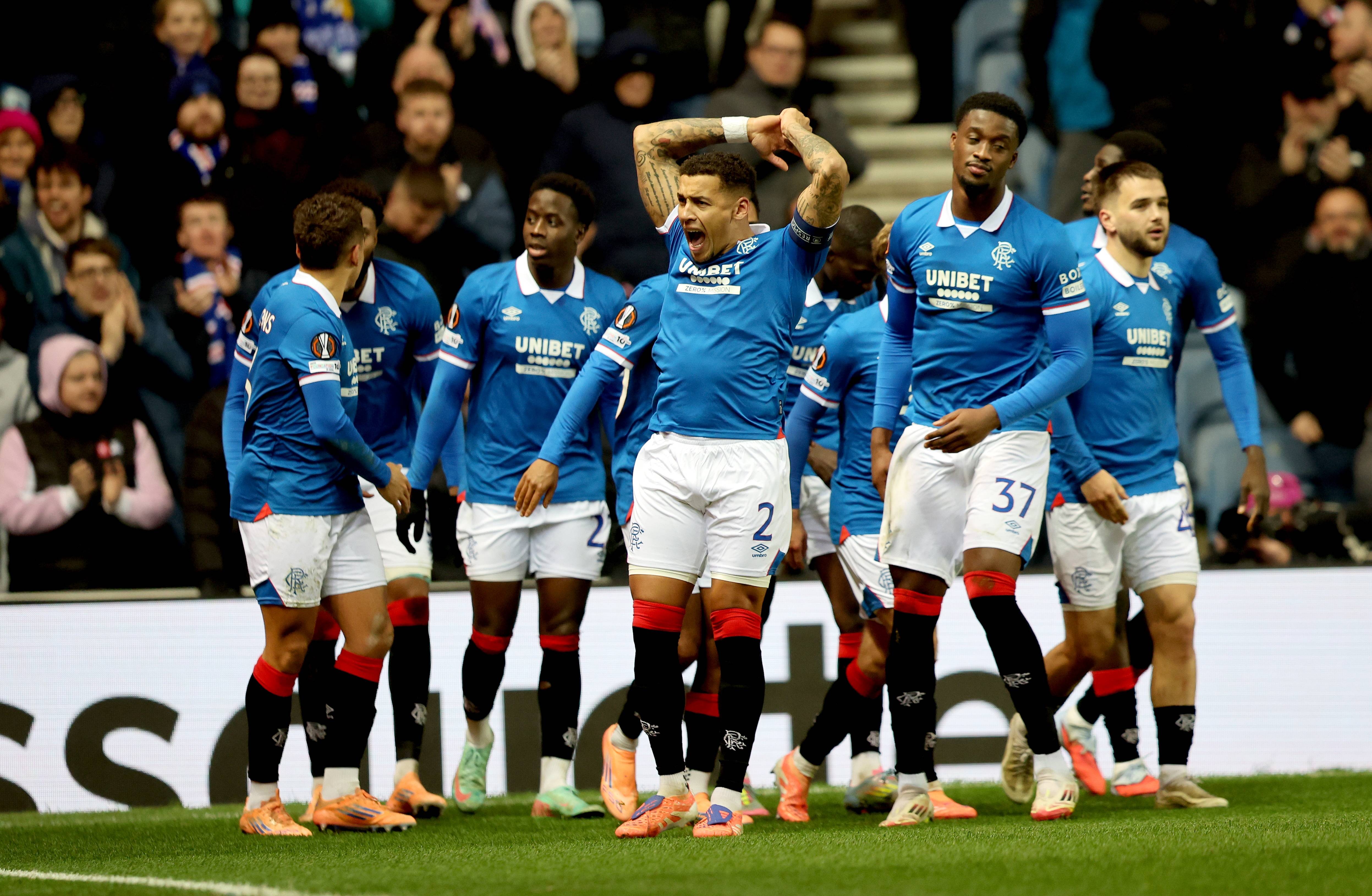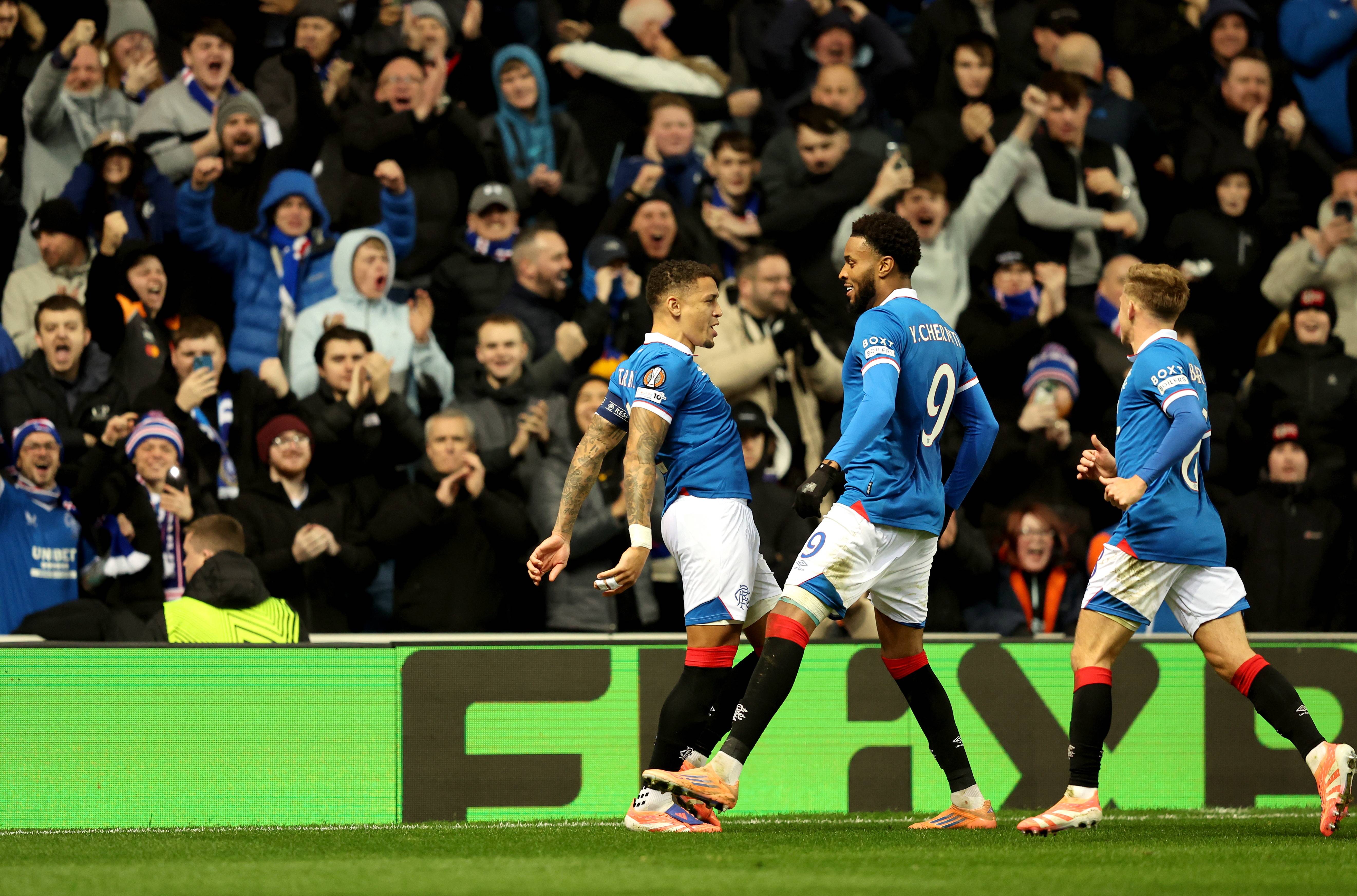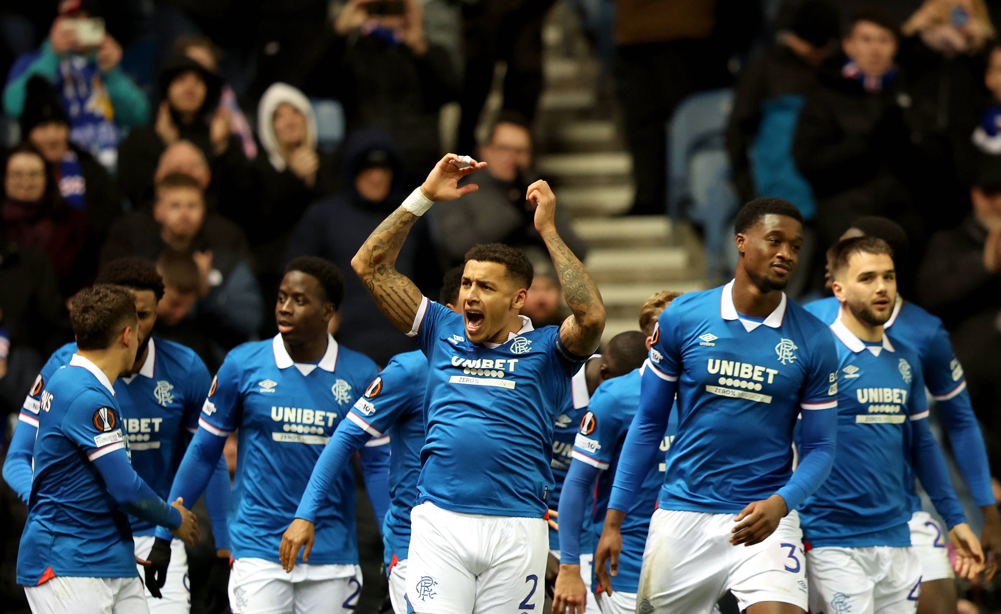 เมื่อวันที่ 27 พฤศจิกายน เจมส์ ทาเวอร์เนียร์ (ซ้าย) นักเตะกลาสโกว์ เรนเจอร์ส ฉลองกับเพื่อนร่วมทีมหลังจากทำประตูได้ สำนักข่าวซินหัว/EPA