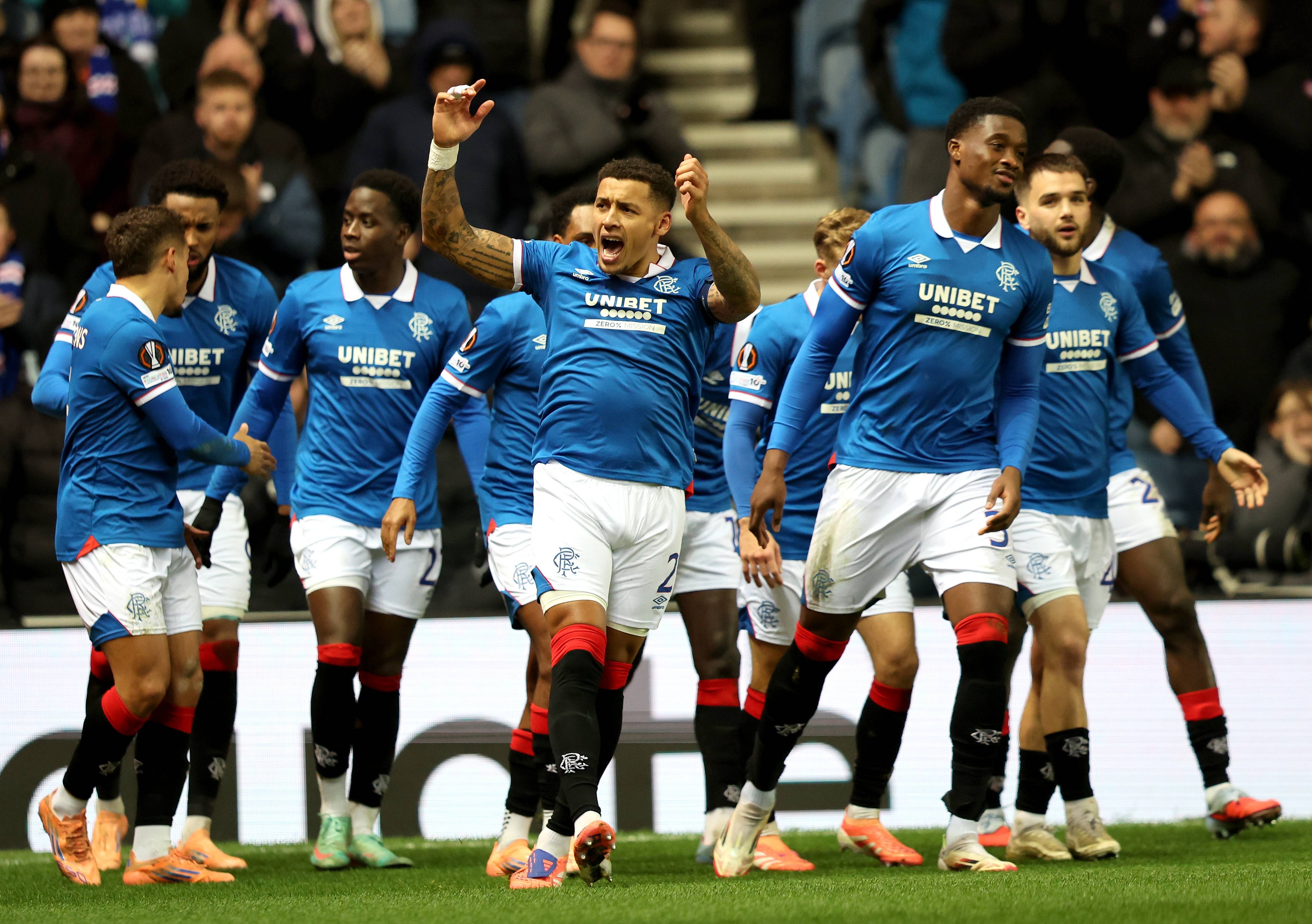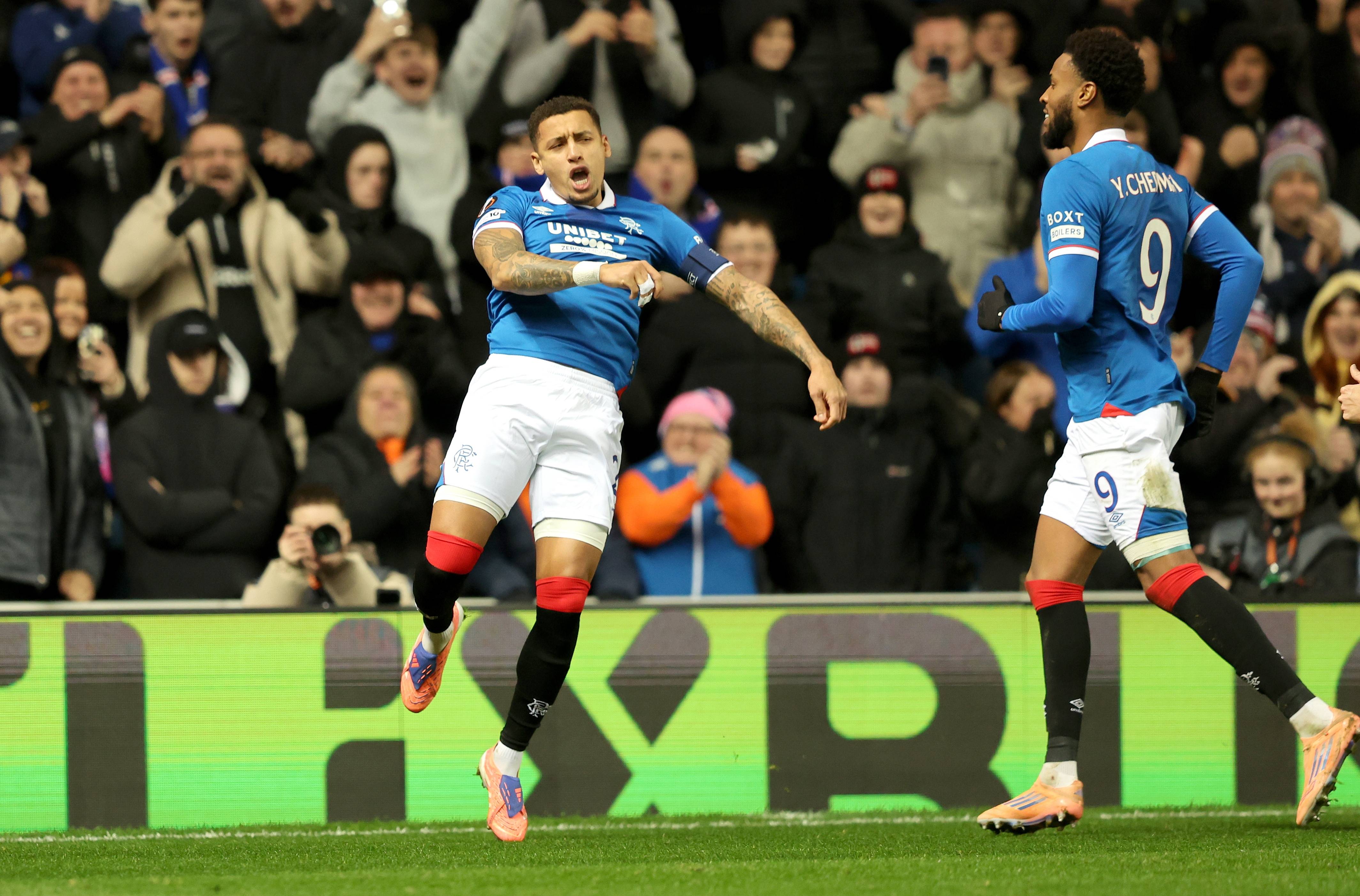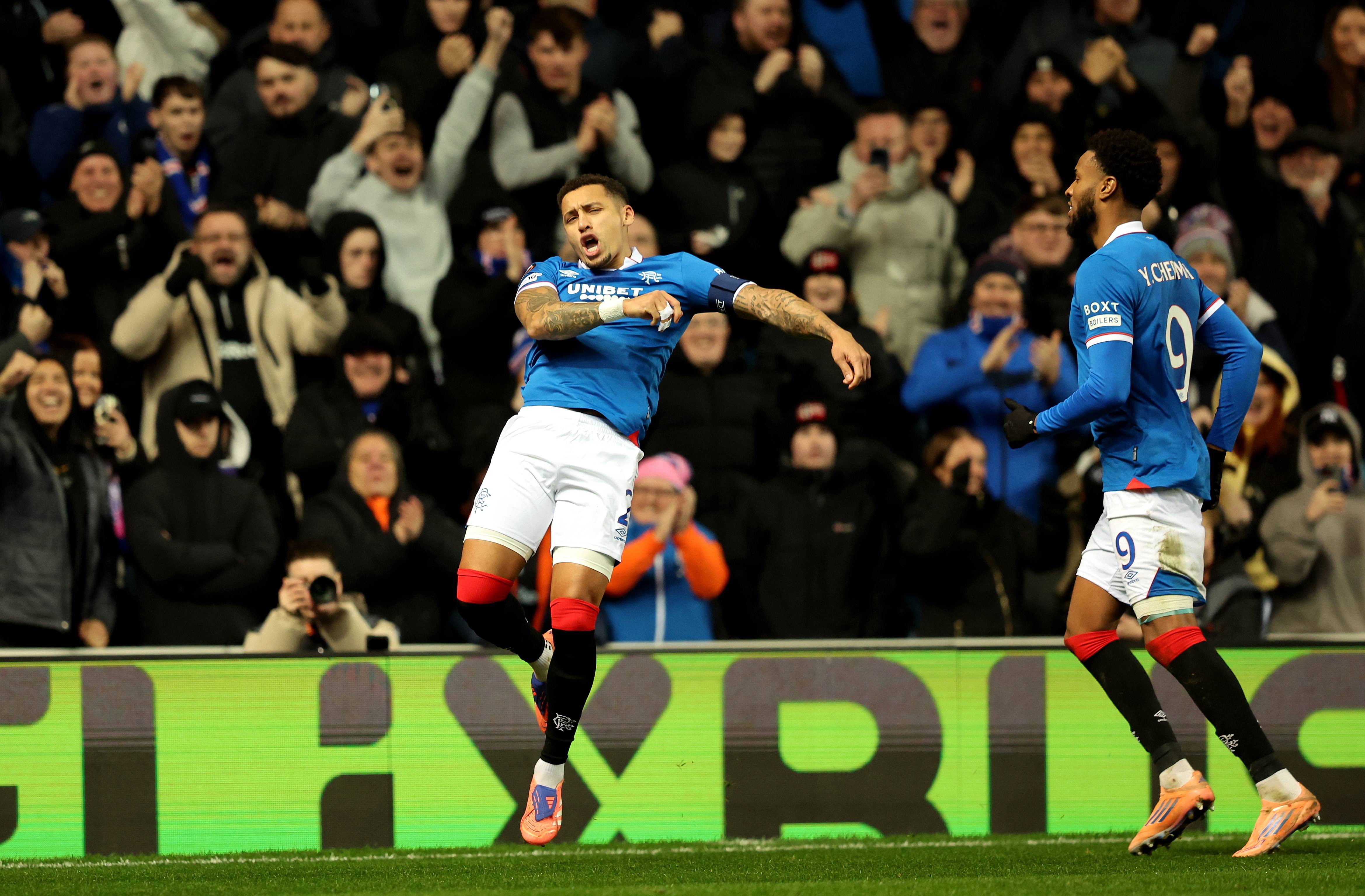 เมื่อวันที่ 27 พฤศจิกายน เจมส์ ทาเวอร์เนียร์ (ซ้าย) นักเตะกลาสโกว์ เรนเจอร์ส ฉลองกับเพื่อนร่วมทีมหลังจากทำประตูได้ สำนักข่าวซินหัว/EPA