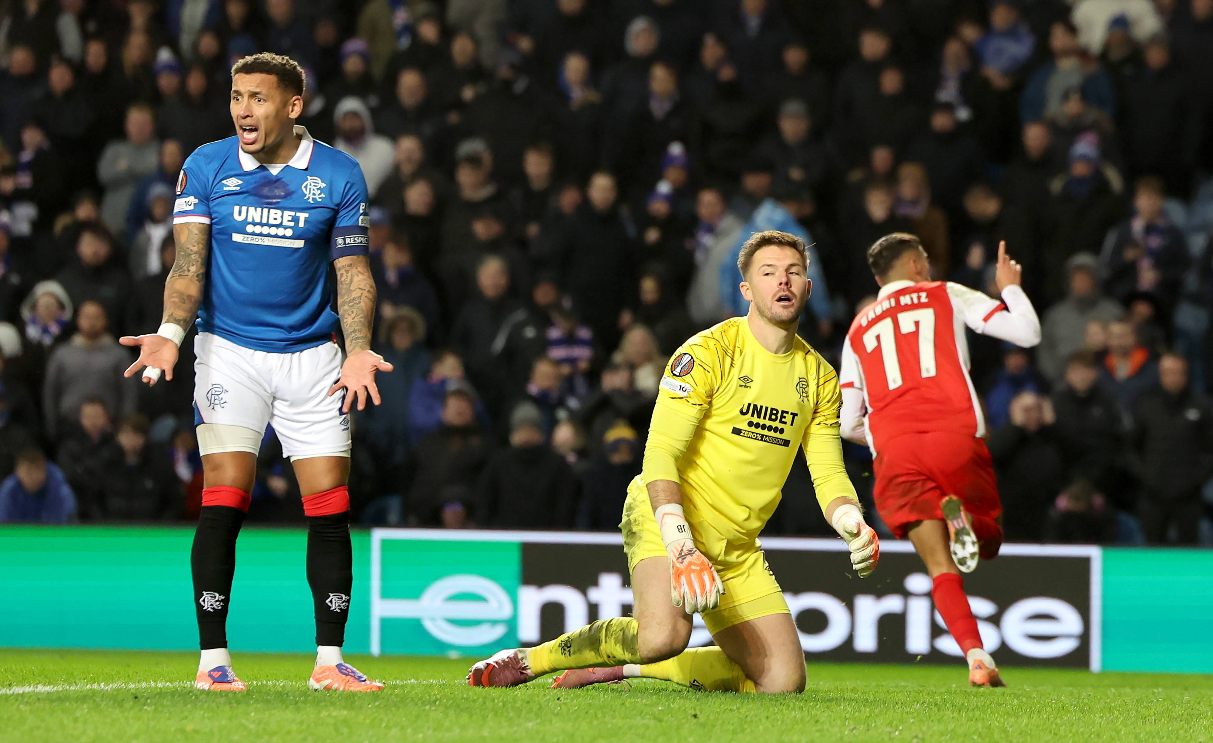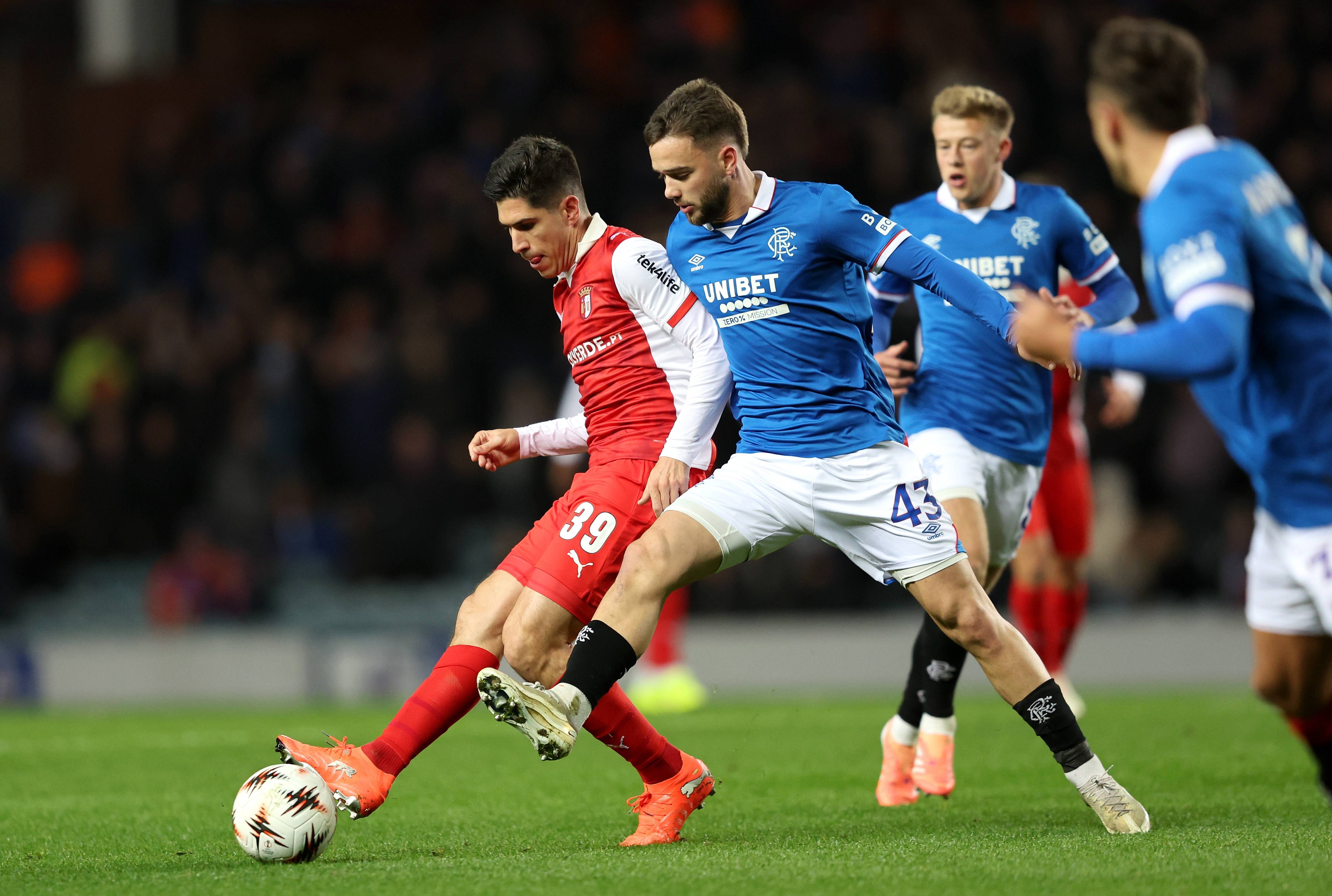 เมื่อวันที่ 27 พฤศจิกายน นักเตะของเรนเจอร์ส บาร์เรน (ขวา) เข้าแย่งบอลกับโกเมส นักเตะของบรากา ซีเอ็นเอ/อีพีเอ
