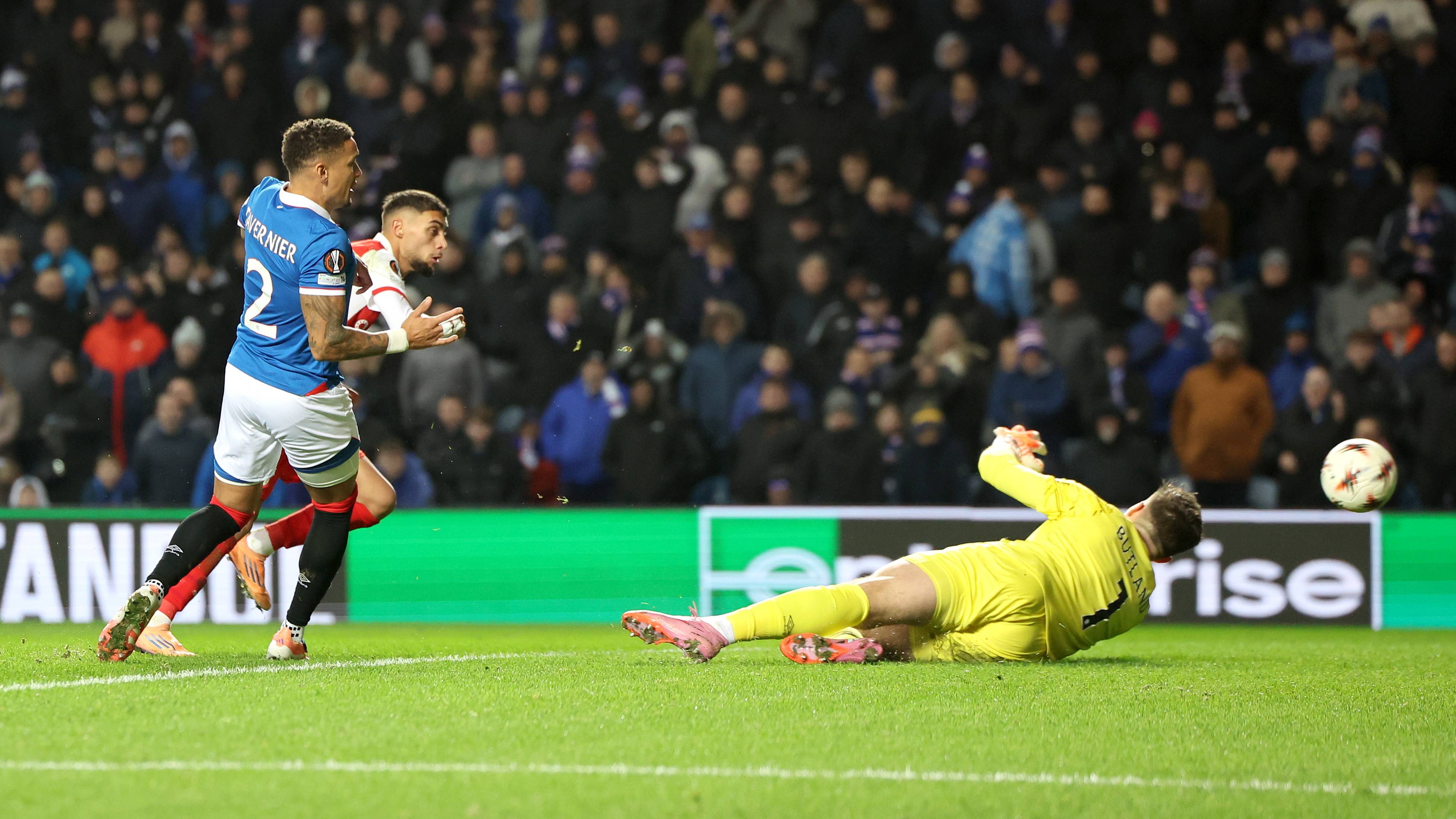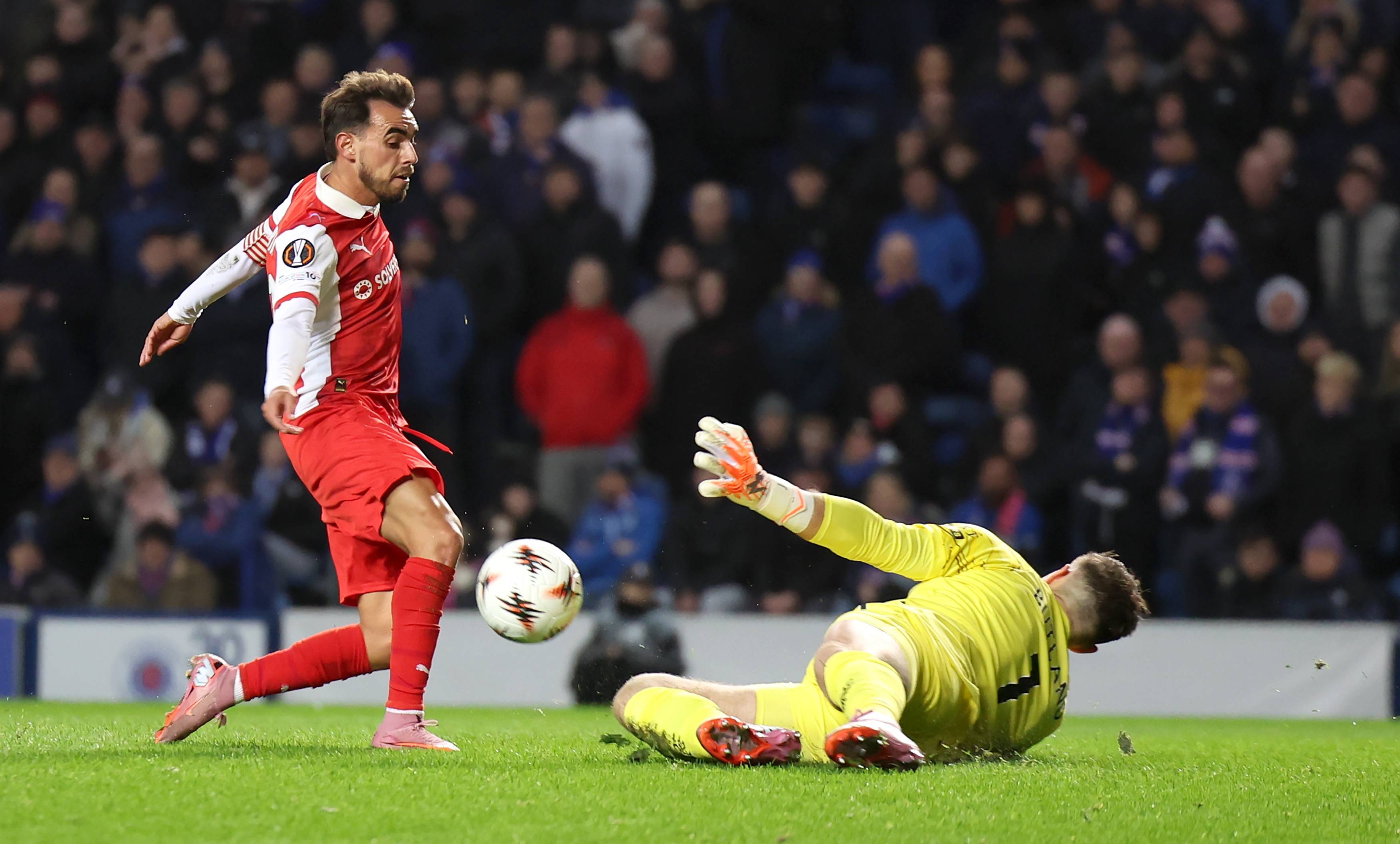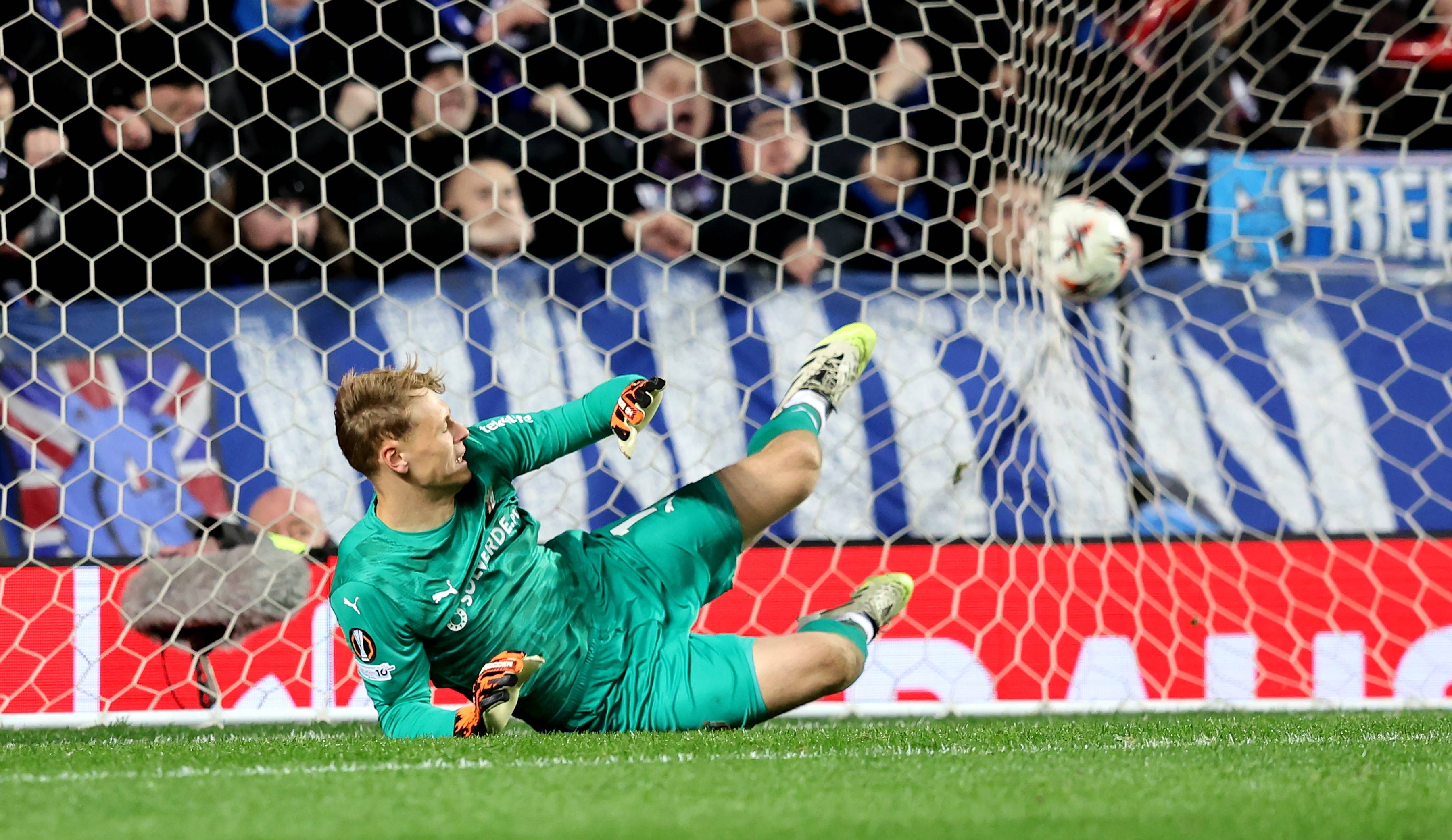 เมื่อวันที่ 27 พฤศจิกายน จอร์แดน เบตแลนด์ ผู้รักษาประตูของกลาสโกว์ เรนเจอร์ส (ขวา) เซฟลูกยิงจากเปโดร ฮอร์ตา ผู้เล่นของบรากา สำนักข่าวซินหัว/EPA