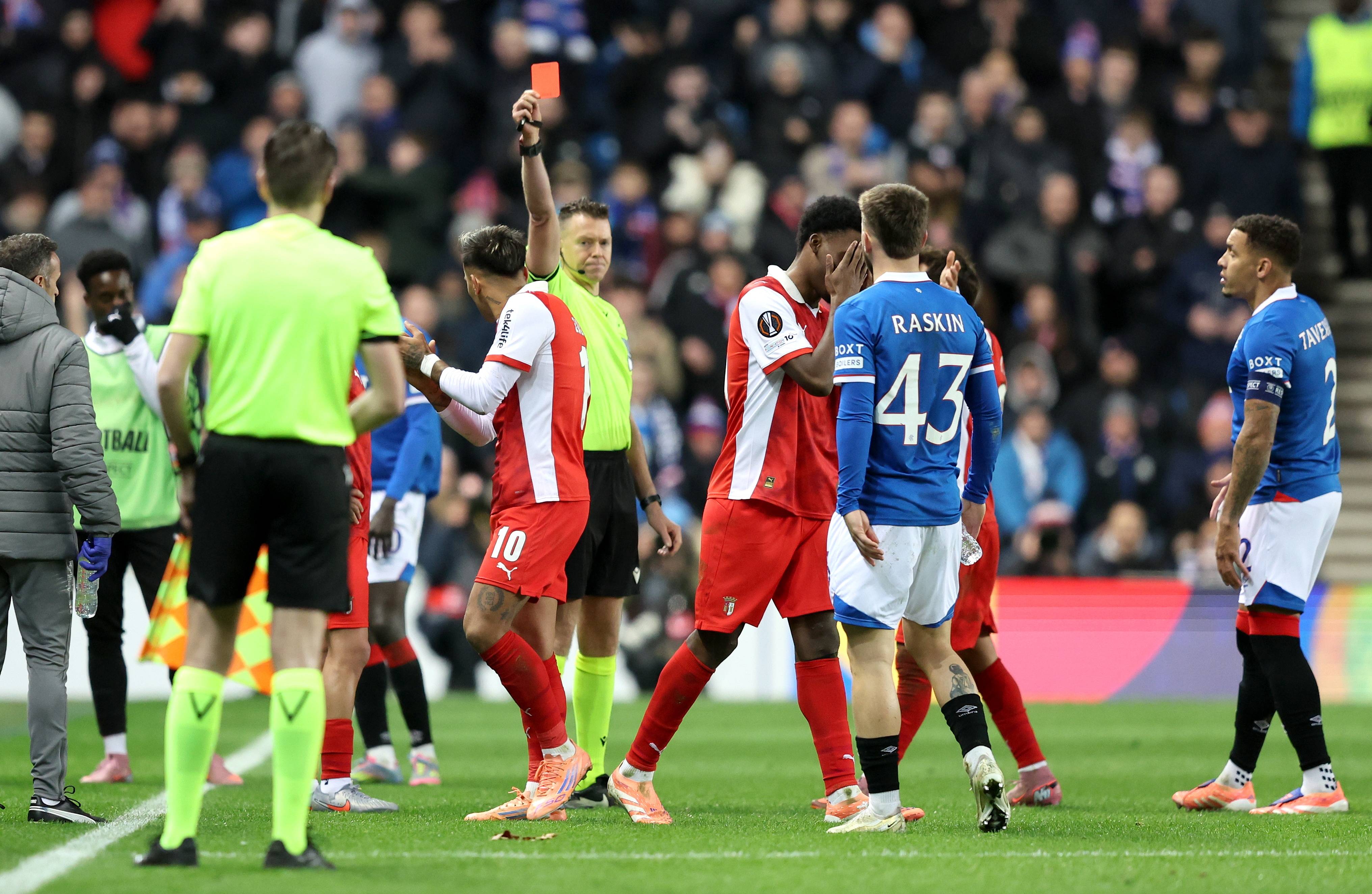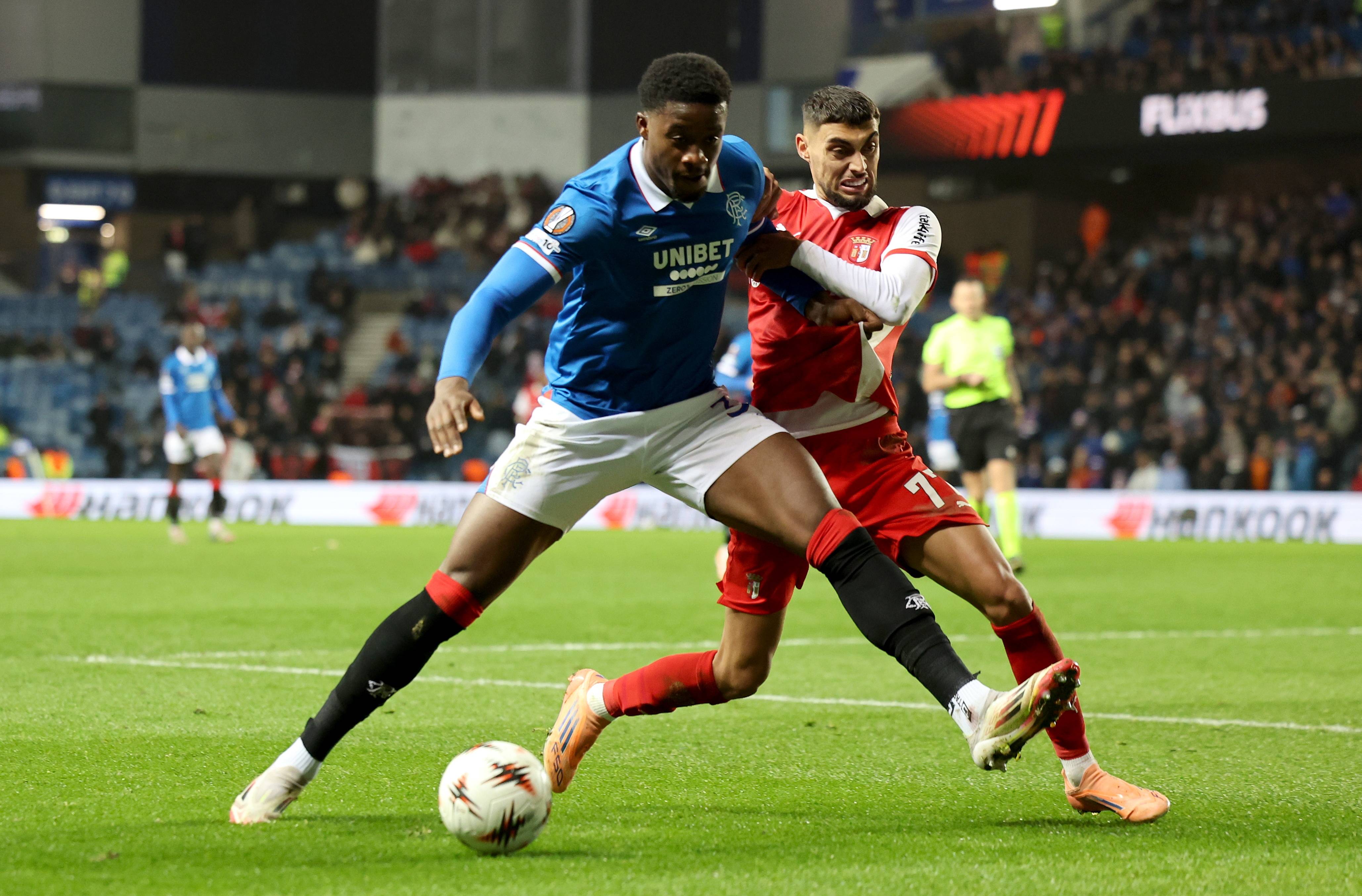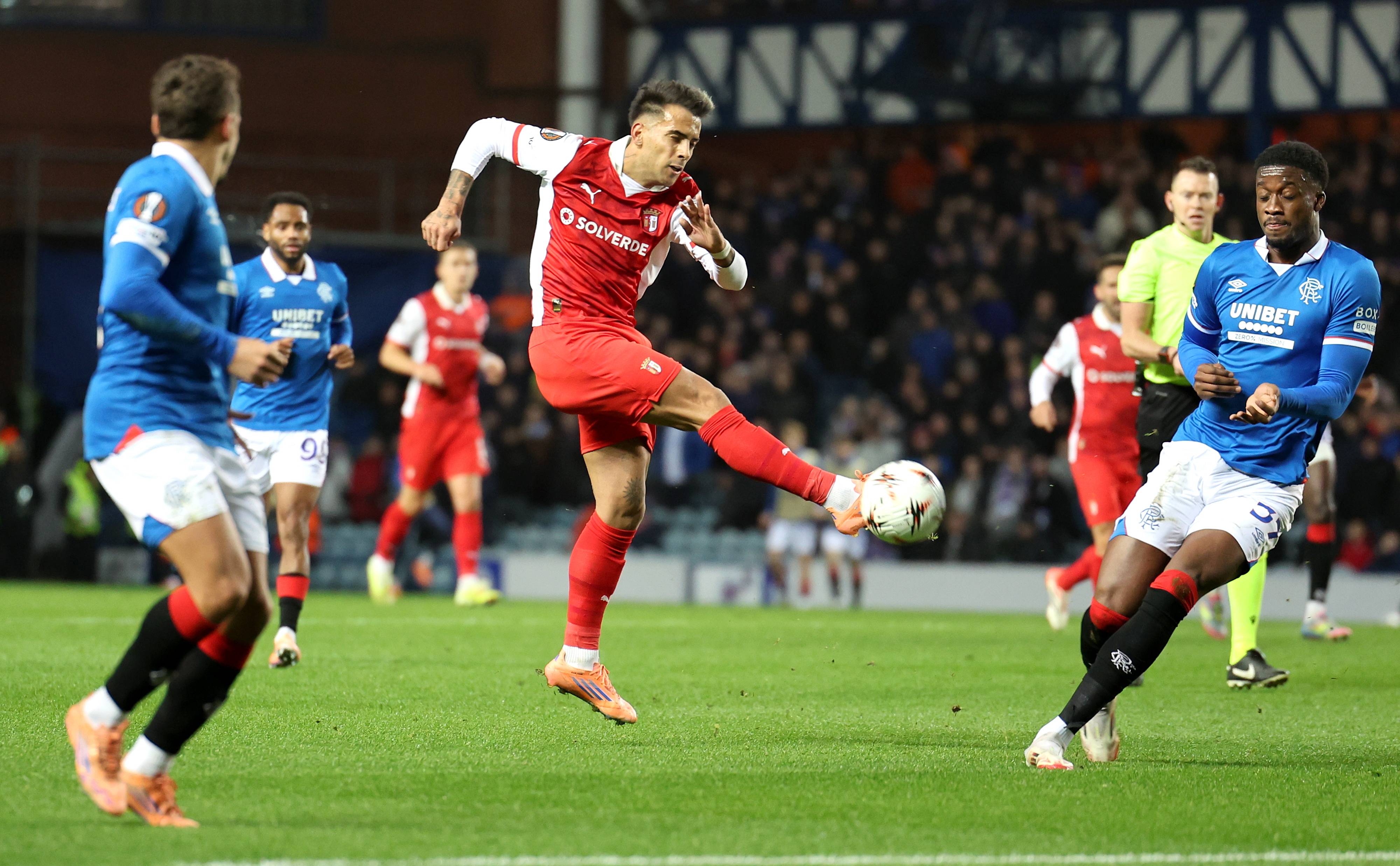 เมื่อวันที่ 27 พฤศจิกายน นักเตะของเรนเจอร์ส เฟอร์นันเดส (ซ้าย) เข้าปะทะกับมาร์ติเนซของบรากาเพื่อแย่งบอล ซีเอ็นเอ/อีพีเอ