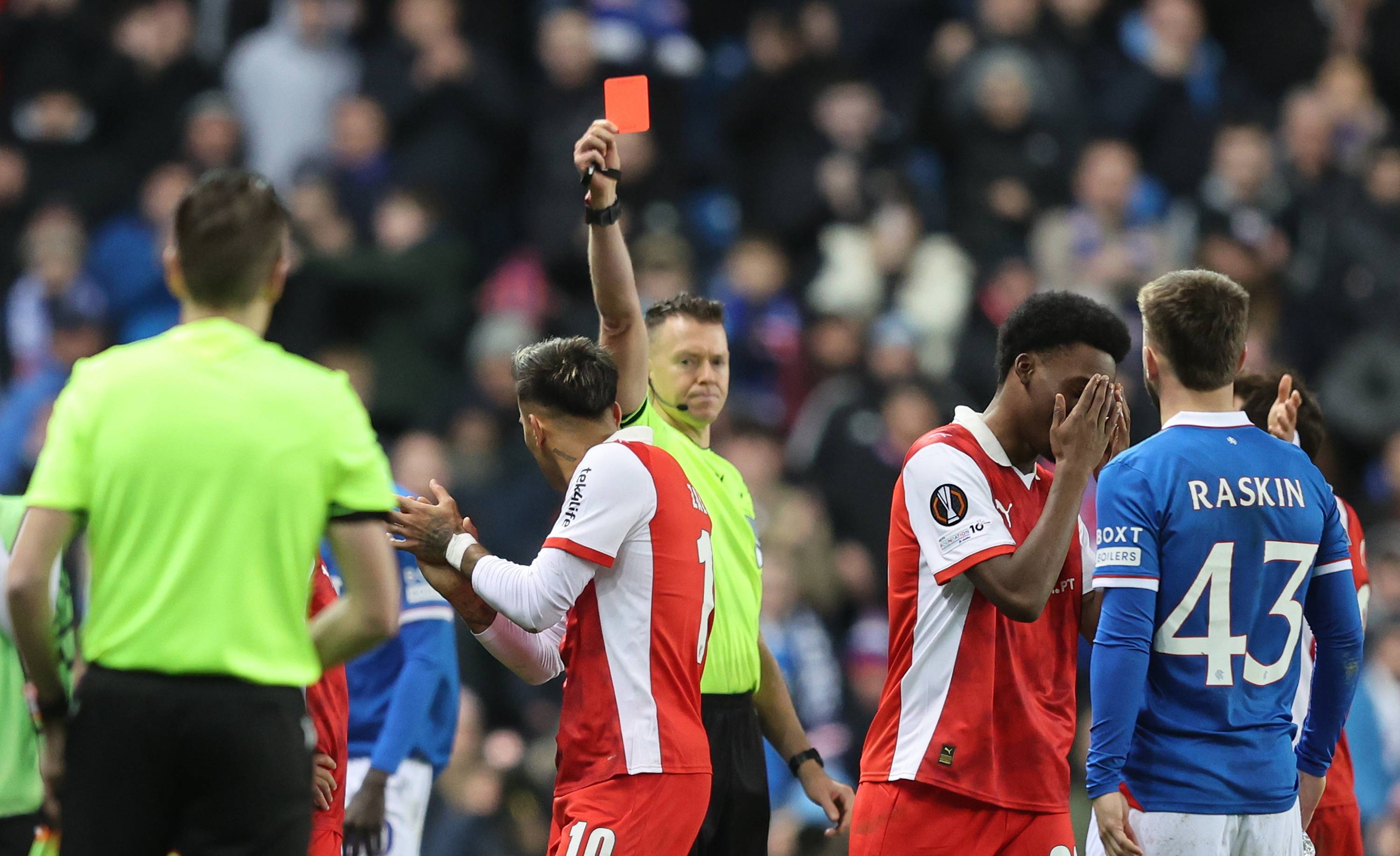 เมื่อวันที่ 27 พฤศจิกายน นักเตะบราการา ซาลาซาร์ (กลาง) ถูกผู้ตัดสินแจกใบแดง ซีเอ็นเอ/อีพีเอ