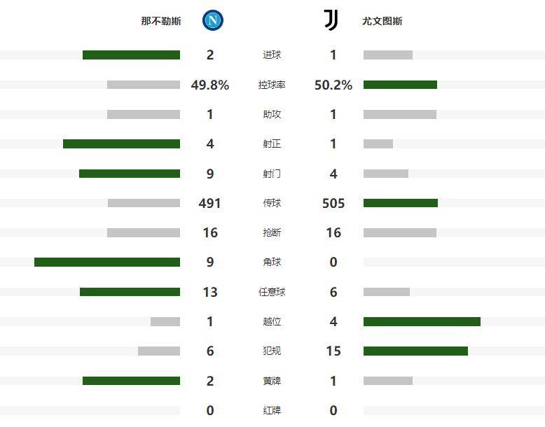 ในนาทีที่ 20 อิลดิซยิงไกลจากขอบเขตโทษอย่างกะทันหัน แต่บอลไม่ตรงกรอบ หกนาทีต่อมา นาโปลีเปิดเกมรุกอีกครั้ง หลังจากเตะมุมเชิงกลยุทธ์ ดิ ลอเรนโซ่โหม่งบอลที่เสาแรก แต่ดิ เกรกอริโอก็ปัดบอลออกไปได้ทันในนาทีที่ 34 อิลดิซได้เปิดบอลเข้าไปในกรอบเขตโทษ มอบโอกาสทองให้กับเควิน ตูเร่ แต่เขากลับพลาดโอกาสทองนี้ไป ทำให้ไม่สามารถทำประตูตีเสมอให้กับยูเวนตุสได้