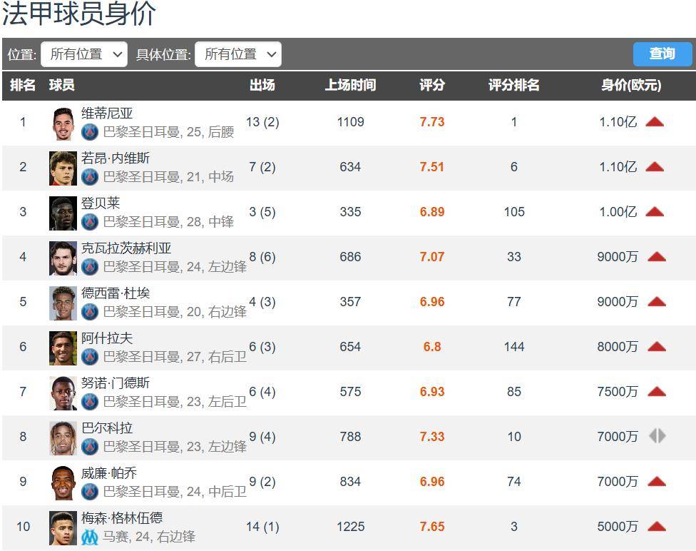 มูลค่าตลาดล่าสุด 10 อันดับแรกในลีกเอิง: ผู้เล่นเก้าอันดับแรกตามมูลค่าทั้งหมดมาจากปารีส แซงต์-แชร์กแมง นอกเหนือจากสามดาวที่มีมูลค่าเกิน 100 ล้านยูโร – วิตินญ่า, ฌานูเอเวส และอุสมาน เดมเบเล่ – ควิชา ควารัตสเคเลีย และดูเอ้ก็มีมูลค่า 90 ล้านยูโรเช่นกัน ทั้งสองคนอายุ 24 และ 20 ปีตามลำดับ พวกเขายังมีพื้นที่ให้เติบโตอีกมาก การประเมินมูลค่าครั้งต่อไปของพวกเขาอาจทำให้พวกเขาเข้าร่วมกับกลุ่มผู้เล่นมูลค่า 100 ล้านยูโรได้