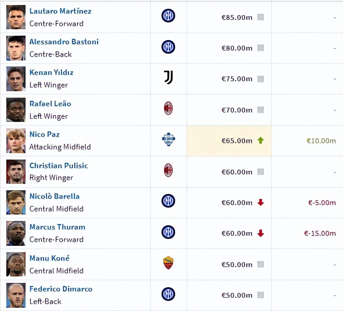 เซเรียอาตอนนี้พบว่าตัวเองตามหลังลีกใหญ่สี่ลีกอื่น ๆ อยู่ Transfermarkt ได้อัปเดตมูลค่าผู้เล่นของเซเรียอาเมื่อวันที่ 23 ธันวาคม โดยกองหน้าของอินเตอร์มิลานอย่างเลาตาโรยังคงครองอันดับหนึ่ง ขณะที่ดาวรุ่งพุ่งแรงของโคโมอย่างปาสคาลพุ่งขึ้น 10 ล้านยูโรมาอยู่อันดับที่ห้า เซเรียอาเป็นลีกเดียวในห้าลีกใหญ่ที่ไม่มีผู้เล่นที่มีมูลค่า 100 ล้านยูโร (มิสเตอร์ 100 ล้าน) ซึ่งค่อนข้างน่าอาย