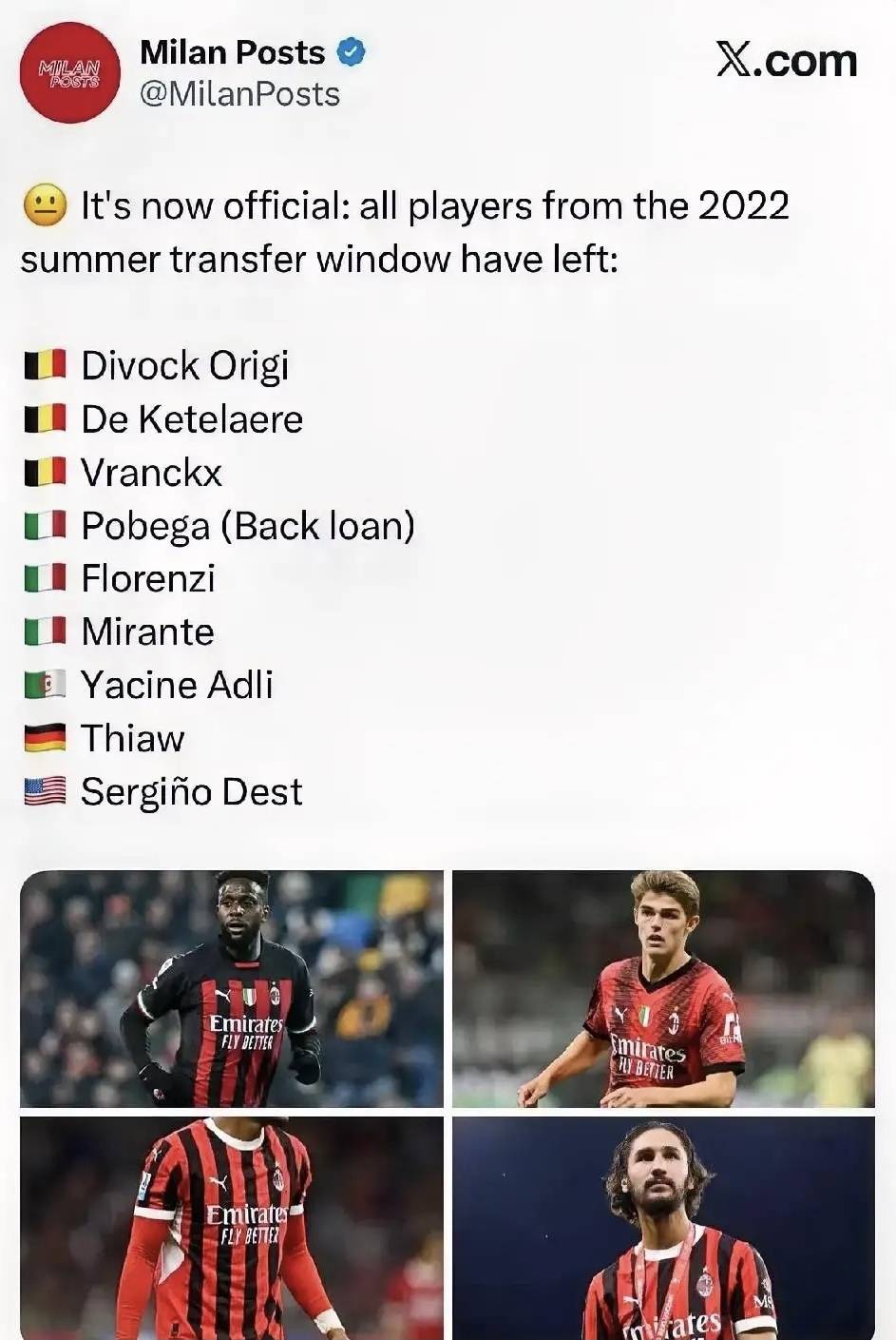 ล่มสลายอย่างสิ้นเชิง! นักเตะทุกคนที่มิลานเซ็นสัญญาในช่วงตลาดซื้อขายนักเตะฤดูร้อนปี 2022 ได้ออกจากสโมสรไปแล้วทั้งหมด ในช่วงสามปีที่ผ่านมา การเปลี่ยนแปลงของโค้ชและนักเตะที่มากเกินไปเป็นสาเหตุหลักของผลการแข่งขันที่ไม่คงที่ของทีม โชคดีที่การมาถึงของอัลเลกรีได้ทำให้สถานการณ์กลับมาเสถียรในที่สุด