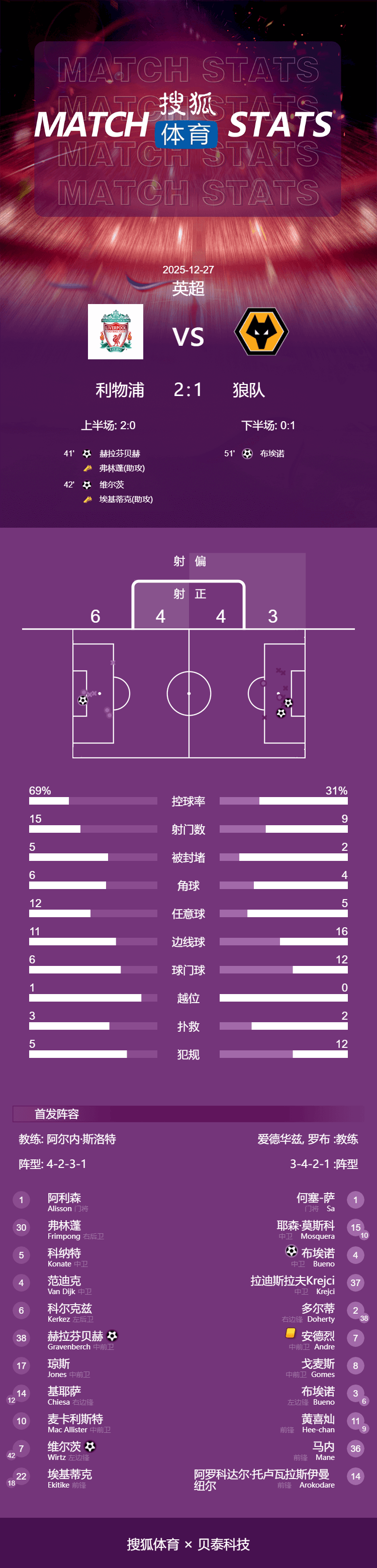 เวลา 23:00 น. ตามเวลาปักกิ่ง วันที่ 27 ธันวาคม การแข่งขันพรีเมียร์ลีกฤดูกาล 2025-26 รอบที่ 18 ยังคงดำเนินต่อไป โดยลิเวอร์พูลเอาชนะวูล์ฟแฮมป์ตัน วันเดอเรอร์ส 2-1 ที่สนามแอนฟิลด์ ผลการแข่งขันนี้ทำให้พวกเขาชนะพรีเมียร์ลีกติดต่อกันเป็นครั้งที่สาม และขยายสถิติชนะติดต่อกันในทุกรายการแข่งขันเป็นสี่นัด และรักษาสถิติไม่แพ้ใครใน 7 นัดติดต่อกันฮราฟน์สสันเปิดสกอร์ในนาทีที่ 41 ก่อนที่เอกิติชจะแอสซิสต์ให้วิร์ตซ์ทำประตูแรกในการลงสนามให้กับทีมหงส์แดงในนาทีที่ 42 ซานติอาโก บูเอโนทำประตูตีตื้นให้หมาป่าจากลูกเตะมุมในนาทีที่ 51 นอกจากนี้ เอกิติชและแม็ค อัลลิสเตอร์ยังยิงไปชนเสาคนละครั้ง