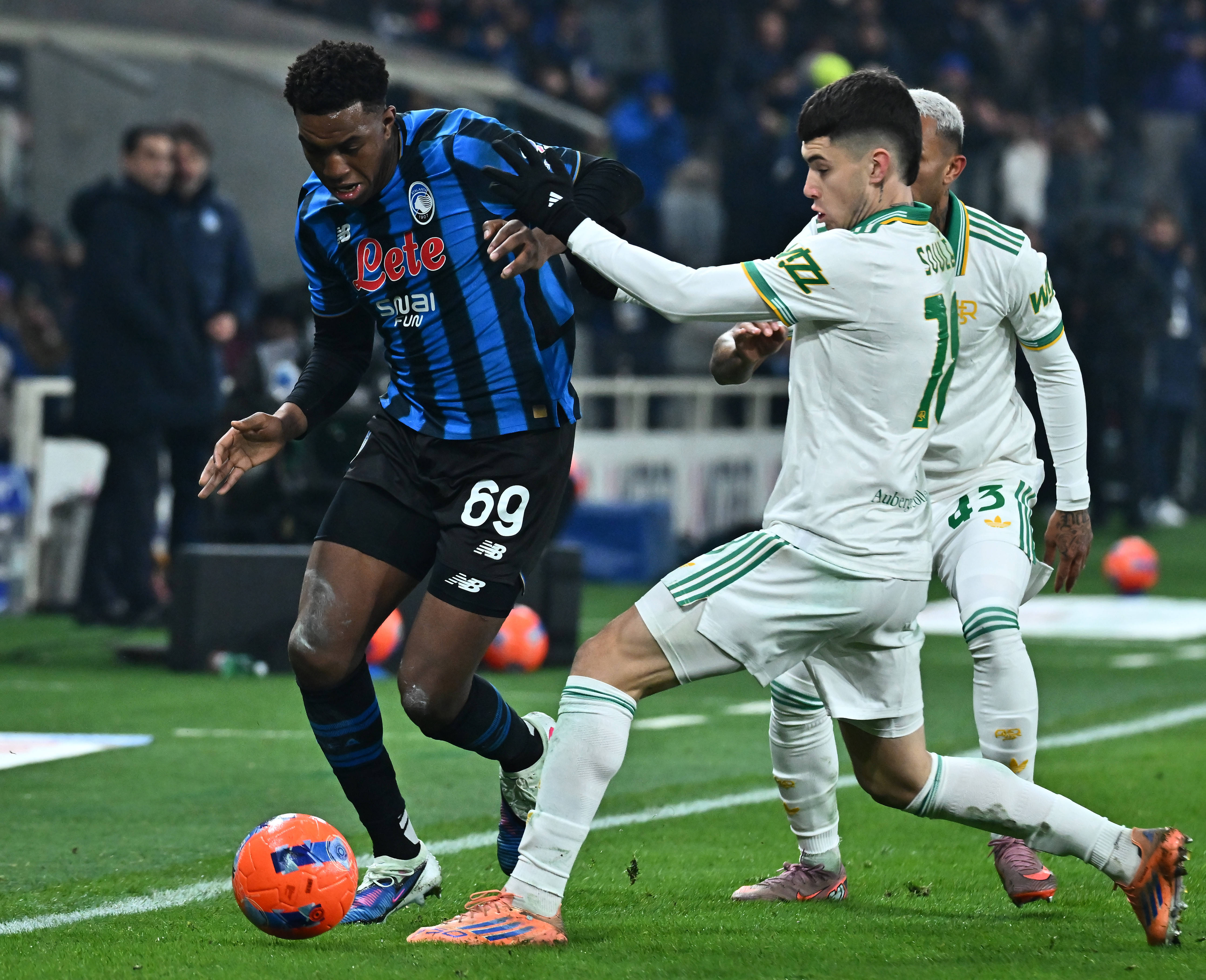 เมื่อวันที่ 3 มกราคม นักเตะอตาลันต้า เบอร์นาสโคน (ซ้าย) และอาโนร์ (กลาง) กำลังท้าทายซูเลย์ของโรม่าในการแข่งขัน สำนักข่าวซินหัว (ภาพโดย อัลแบร์โต ลิงเกีย)