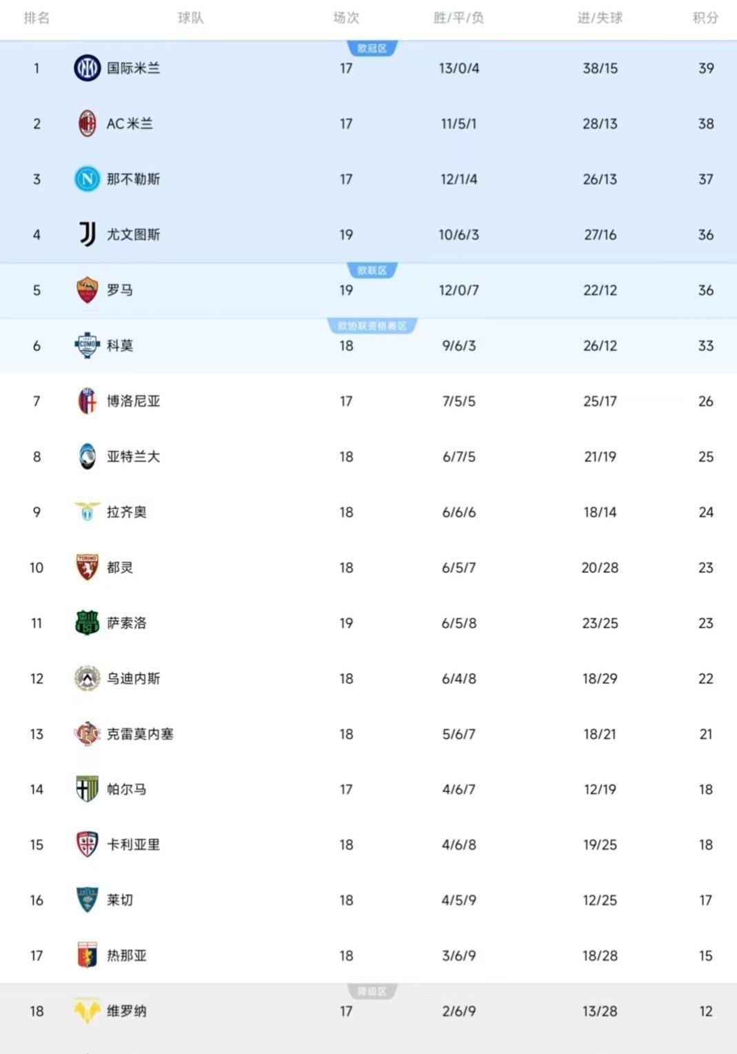 เมื่อวันที่ 7 มกราคม เวลาปักกิ่ง อันดับตารางคะแนนกัลโช่ เซเรีย อา เปลี่ยนแปลงไปอย่างเงียบๆ อินเตอร์ มิลาน ขึ้นนำเป็นจ่าฝูงด้วย 39 คะแนน เอซี มิลาน ตามมาติดๆ ด้วย 38 คะแนน ขณะที่ นาโปลี ยังคงอยู่ในเส้นทางลุ้นแชมป์ด้วย 37 คะแนน การแข่งขันชิงแชมป์ยังคงดุเดือดระหว่างสามทีมนี้ อย่างไรก็ตาม หากมองลงไปในตารางคะแนน จะเห็นเรื่องราวที่น่าสนใจเกิดขึ้น