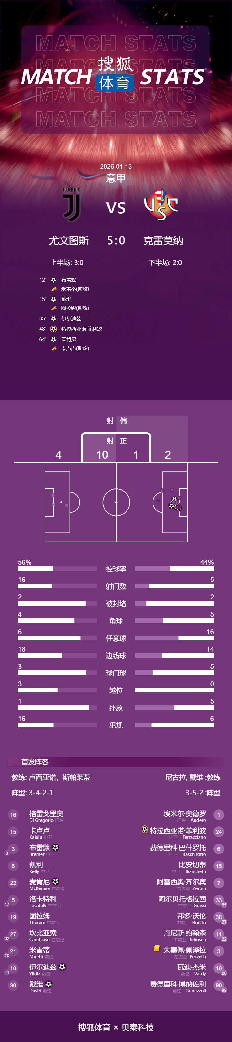 ในนาทีที่ 48 ฟิลิปโปของเครโมนาทำเข้าประตูตัวเองโดยไม่ตั้งใจ ทำให้ยูเวนตุสขึ้นนำเป็น 4-0