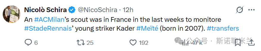 ผู้เชี่ยวชาญด้านการย้ายทีมชาวอิตาลี จานลูก้า ดิ มาร์ซิโอ รายงานในวันนี้ว่า สเก๊าท์ของเอซี มิลาน ได้ติดตามดูผลงานของ คาเดร์ เมอิเต้ กองหน้าเกิดปี 2007 ในช่วงสัปดาห์ที่ผ่านมาในฝรั่งเศส