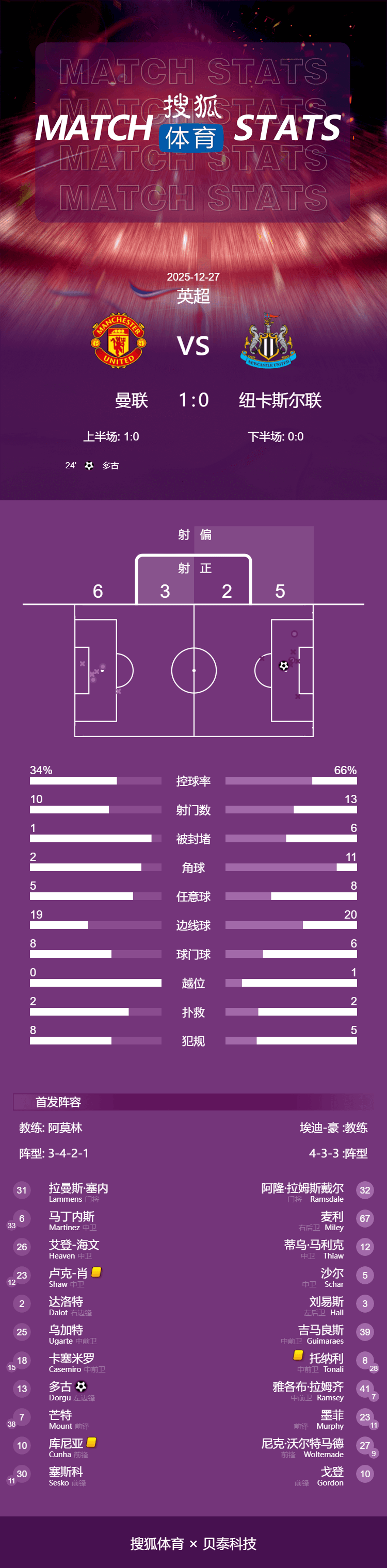 ในช่วงเช้าตรู่ของวันที่ 27 ธันวาคม ตามเวลาปักกิ่ง แมนเชสเตอร์ ยูไนเต็ด เปิดบ้านต้อนรับนิวคาสเซิล ยูไนเต็ด ในการแข่งขันพรีเมียร์ลีก ฤดูกาล 2025/2026 นัดที่ 18 ในช่วงครึ่งแรก โดกานทำประตูแรกของเขาด้วยการยิงวอลเลย์ในครึ่งหลัง เชสโกยิงชนเสาขณะที่แม็กพายส์พลาดโอกาสหลายครั้ง ในที่สุดยูไนเต็ดก็คว้าชัยชนะในบ้าน 1-0 ได้สำเร็จ ยุติสถิติแพ้สองนัดติดต่อกันกับนิวคาสเซิล ผลการแข่งขันนี้ทำให้พวกเขามีผลงานล่าสุดชนะสาม นัดเสมอสอง และแพ้หนึ่ง จากหกนัดหลังสุดในลีก ทำให้พวกเขาขยับขึ้นสู่อันดับที่ห้าในตารางลีกชั่วคราว