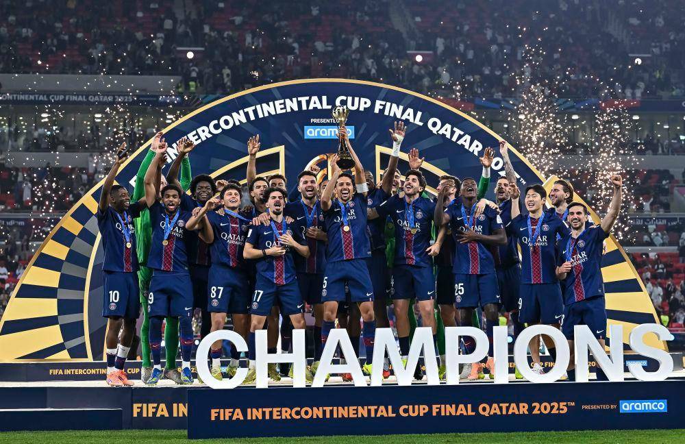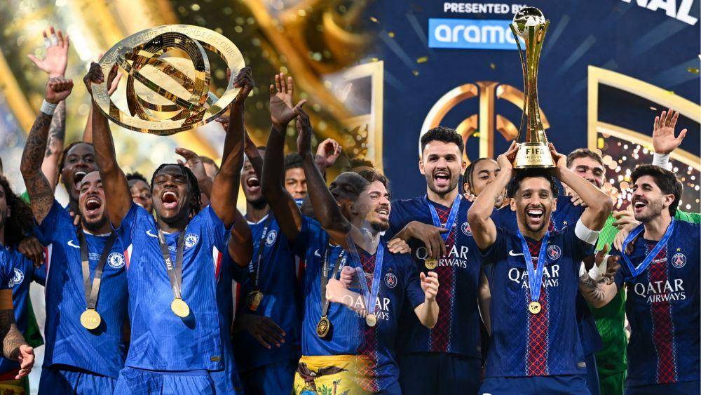 ภาพตัดต่อ: ภาพซ้าย แสดงให้เห็นเชลซีชูถ้วยรางวัลในการแข่งขันฟีฟ่า คลับ เวิลด์ คัพ 2025 (ซินหัว/อู๋ เสี่ยวหลิง); ภาพขวา แสดงให้เห็นปารีส แซงต์-แชร์กแมง คว้าชัยชนะในอินเตอร์คอนติเนนตัล คัพ (ซินหัว/นิคุ)