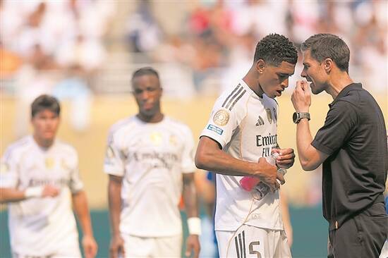 18 มิถุนายน 2025: ผู้จัดการทีมเรอัล มาดริด อลอนโซ่ (ขวา) กำลังให้คำแนะนำกับผู้เล่น เบลลิงแฮม ระหว่างการแข่งขัน สำนักข่าวซินหัว |