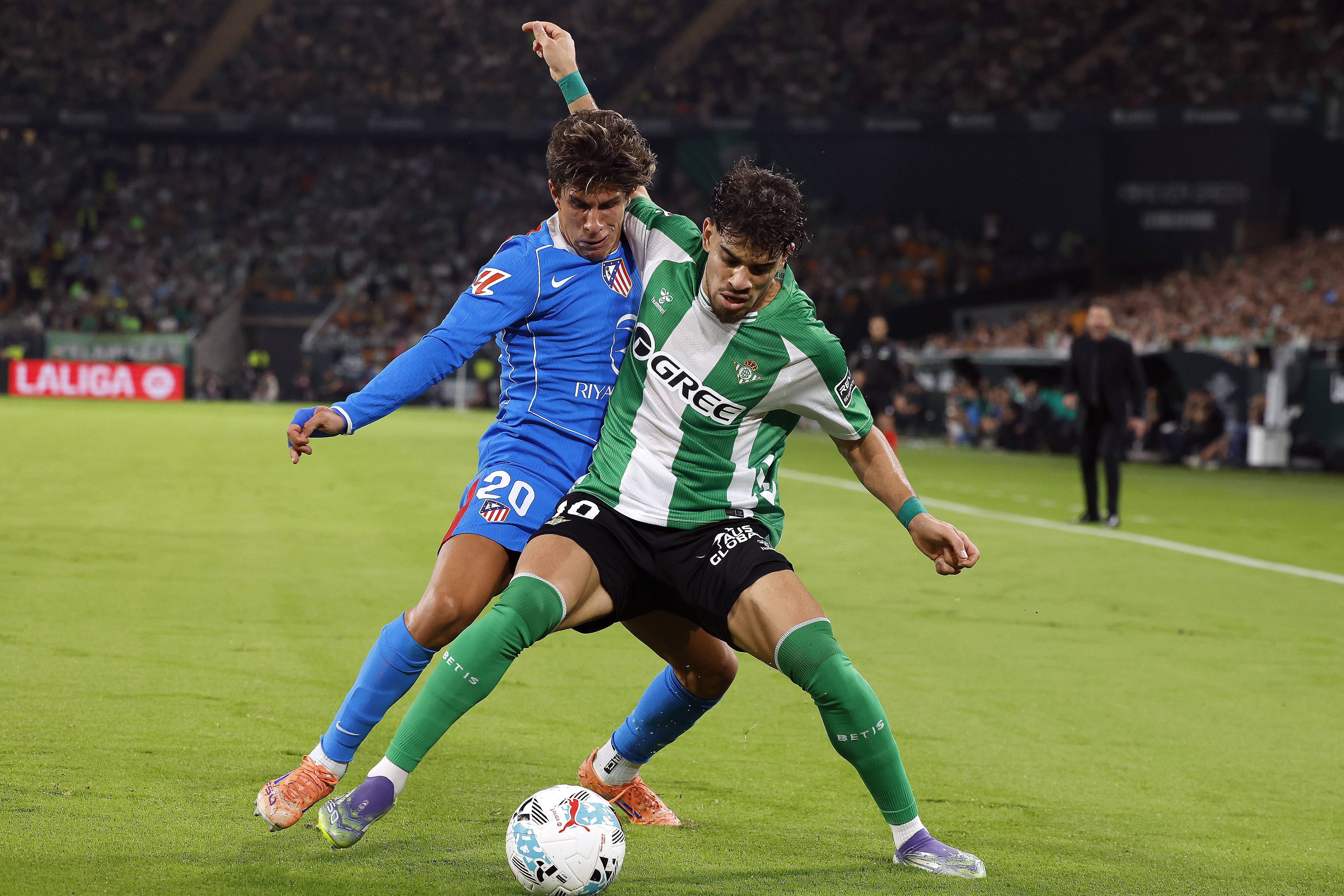 เมื่อวันที่ 27 ตุลาคม โจเซ่ กิเมเนซ ของแอตเลติโก มาดริด (ขวา) เข้าปะทะกับแอนโธนี ของเรอัล เบติส เพื่อแย่งบอล. ซีนา/อีพีเอ