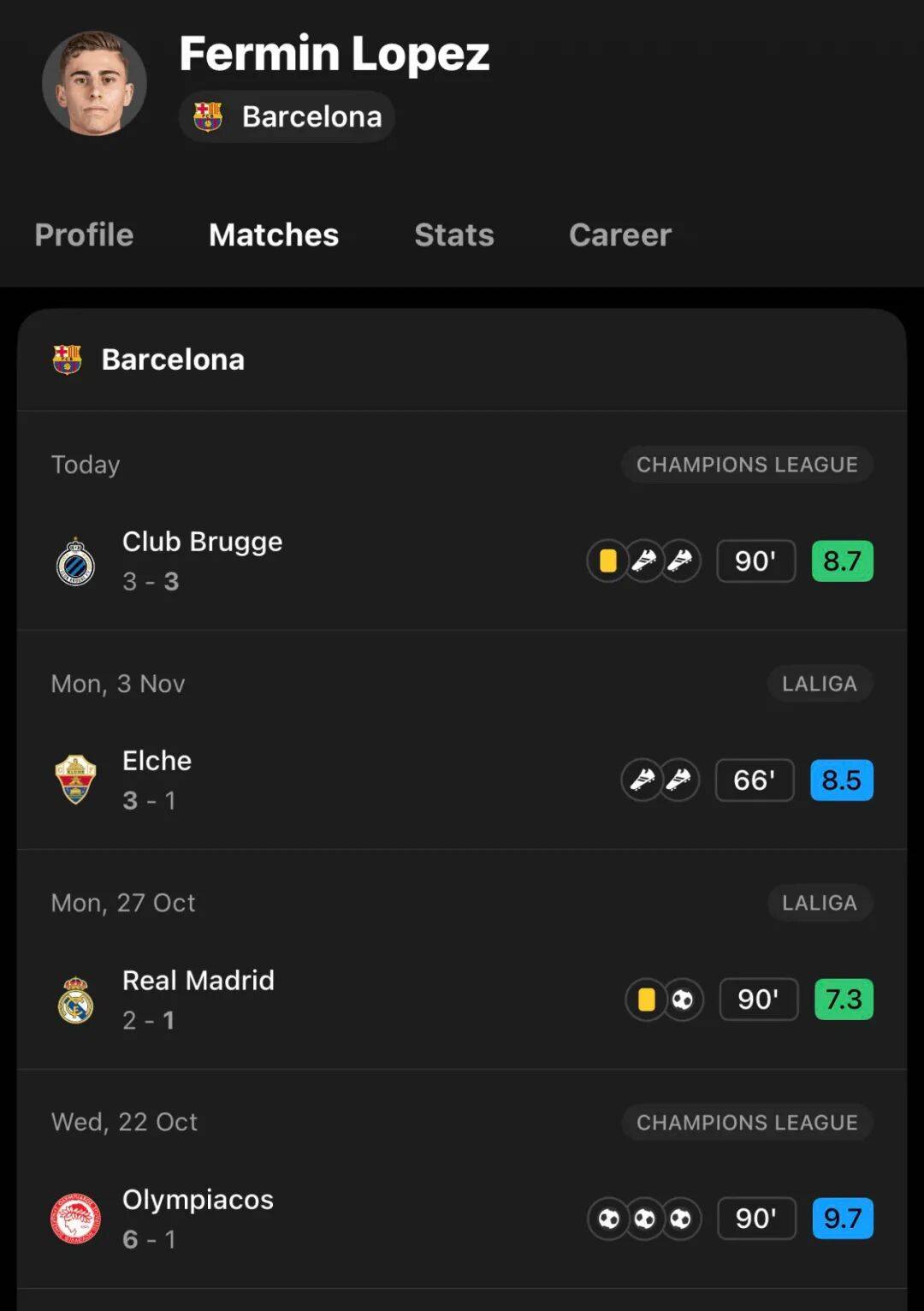 ควรสังเกตว่าในสี่นัดล่าสุด เฟร์มินมีส่วนร่วมในการทำประตูถึงสี่ประตูและสี่แอสซิสต์ สร้างโอกาสทำประตูได้ถึงแปดประตูเพียงลำพัง ในฤดูกาลนี้จนถึงขณะนี้ เขาได้ลงเล่นในสิบนัด โดยเป็นตัวจริงเจ็ดครั้ง และมีส่วนร่วมในการทำประตูถึงหกประตูและสี่แอสซิสต์ ทำให้เขากลายเป็นผู้เล่นแนวรุกที่อันตรายที่สุดในแดนกลางของบาร์เซโลนา