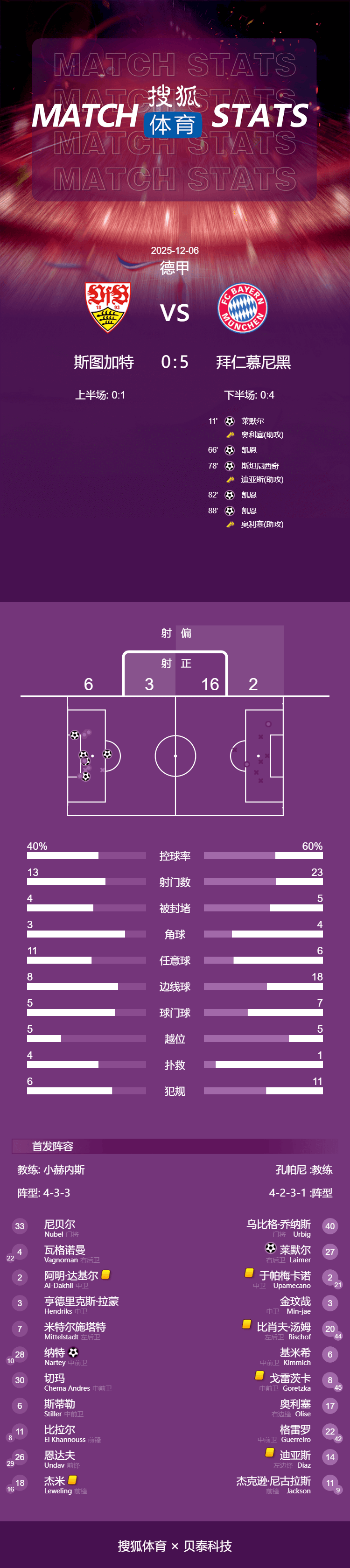 เวลา 22:30 น. ตามเวลาปักกิ่ง วันที่ 6 ธันวาคม บาเยิร์น มิวนิค เดินทางไปพบกับ สตุ๊ตการ์ท ในรอบที่ 13 ของฤดูกาลบุนเดสลีกา 2025-26ในครึ่งแรก เลรอย ซาเน่ จ่ายบอลให้ โจชัว คิมมิช ทำประตูให้บาเยิร์นขึ้นนำ โดยจบครึ่งแรกด้วยสกอร์ 1-0 ให้กับทีมเยือน ครึ่งหลังกลายเป็นเวทีโชว์ของ แฮร์รี่ เคน เมื่อเขาลงสนามเป็นตัวสำรองในนาทีที่ 60 และทำแฮตทริกได้ภายในเวลา 22 นาที เดยัน สตานิซิช ก็ยิงประตูได้เช่นกัน ปิดท้ายชัยชนะอย่างขาดลอย 5-0 ให้กับบาเยิร์น ด้วยชัยชนะ 12 นัดและเสมอ 1 นัดในฤดูกาลนี้ ทำให้ทีมบาวาเรียนนำเป็นจ่าฝูงด้วย 37 คะแนน
